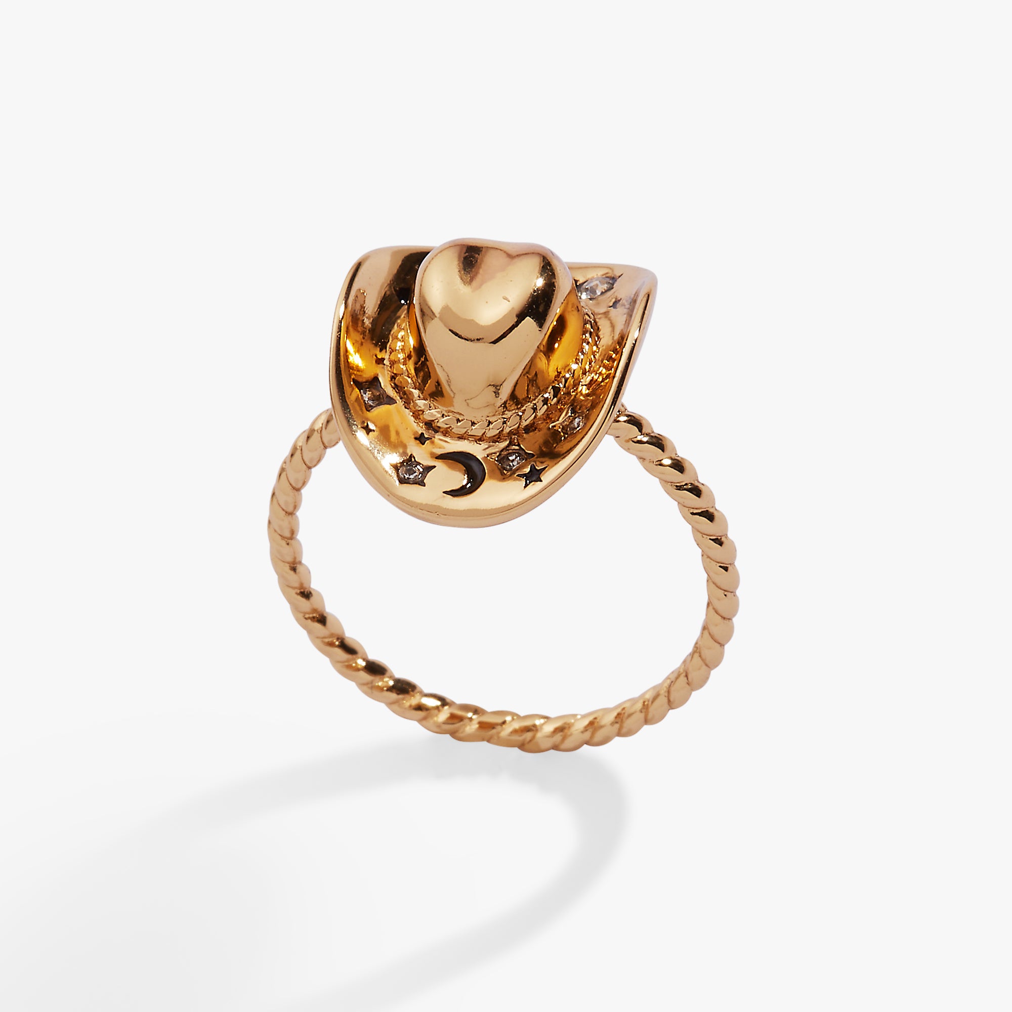 This gold-plated ring features a 3D cowboy hat with a rope-textured band and shank. The hat is decorated with a celestial design and sparkling star-set crystals, offering a whimsical nod to western style. Perfect for those who want to show off their inner rhinestone cowgirl while keeping a playful, cosmic twist.