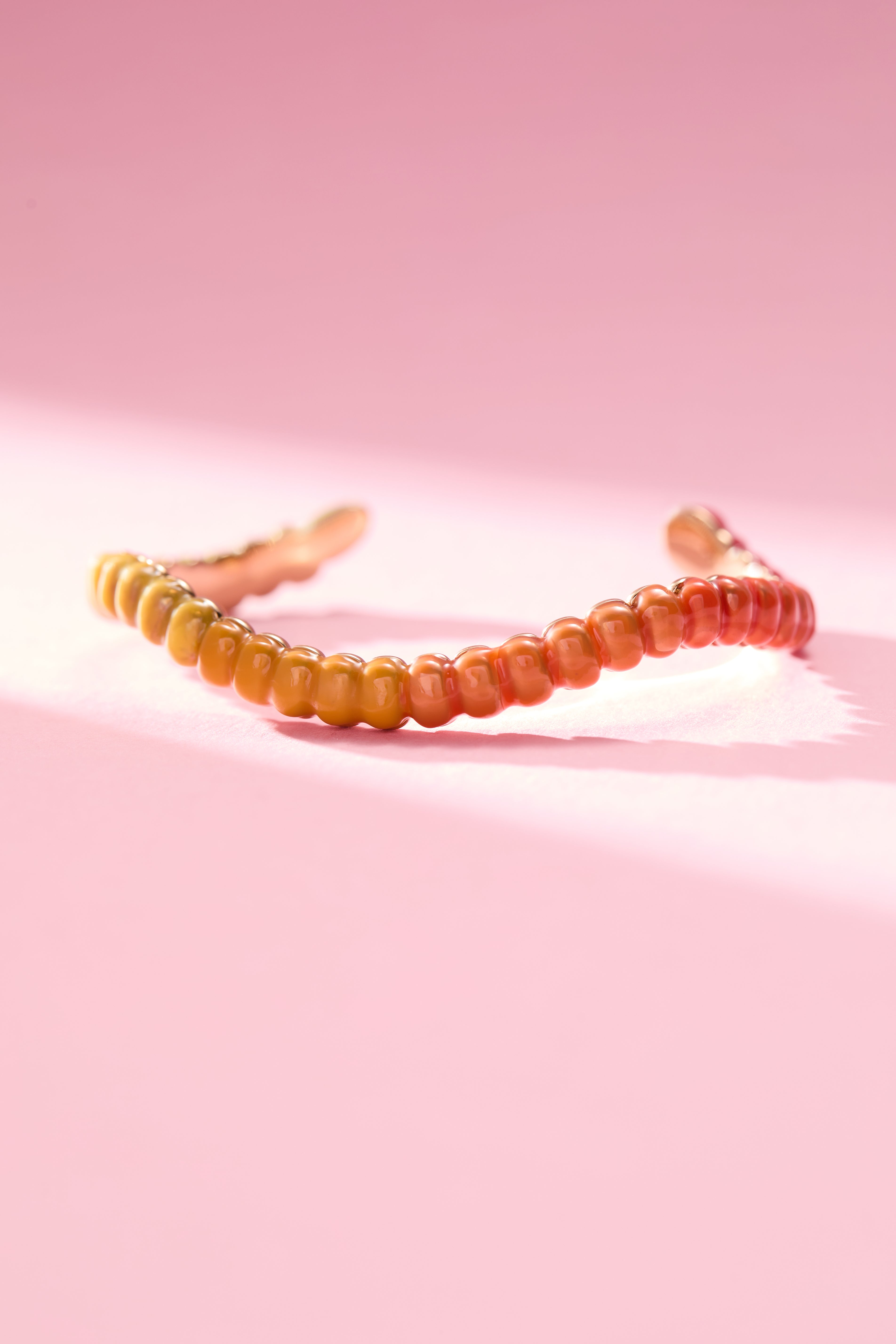 This multicolored resin cuff is designed to look like a gummy worm, featuring translucent, bright hues that create a candy-inspired vibe. Its whimsical style is perfect for Halloween and fans of gummy worms, adding a splash of vibrant fun to any bracelet stack. Plus, its playful design is versatile enough to be worn all year long.