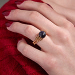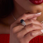 A little dark, a lot dramatic. This ring features intricately sculpted skeleton hands clutching a glossy black orb—blending gothic elegance with sculptural edge. Wear it solo or stacked for a bold look that holds its own, day or night.