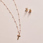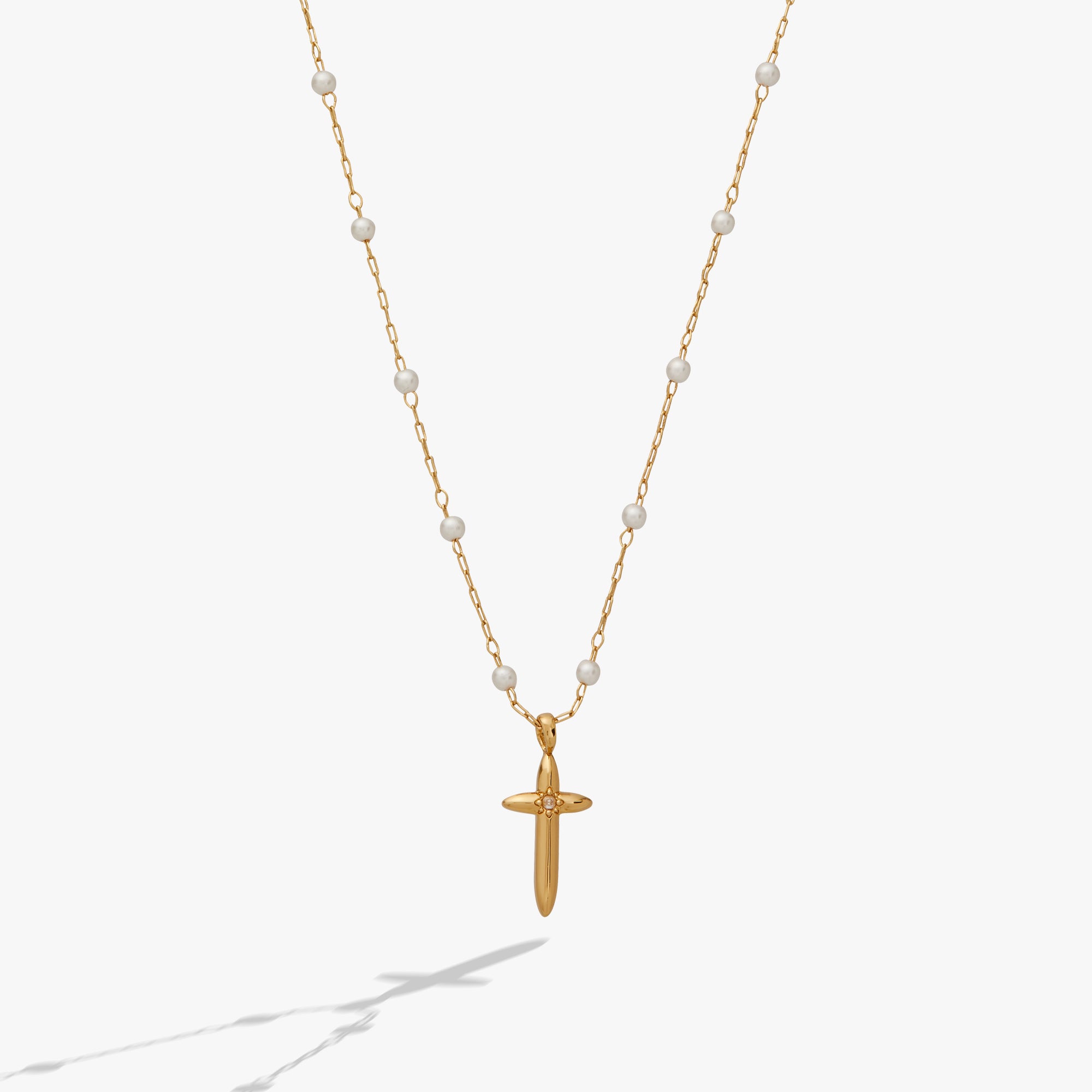Embrace spiritual strength with the 4:13 Cross Pendant Necklace, a sophisticated piece that merges timeless faith with contemporary elegance. Crafted in gold plating, this elongated cross pendant draws inspiration from our signature star design and rests gracefully on a delicate white pearl beaded rosary chain. The back is thoughtfully engraved with "4:13," honoring Philippians 4:13—a powerful reminder that you can accomplish all things through Christ during life's challenges and triumphs. This versatile necklace transcends occasion, seamlessly transitioning from everyday wear to elevated styling. The lustrous pearl beads add a refined, feminine touch that complements both modern and classic aesthetics, making it an ideal foundation for layering or wearing as a standalone statement. Whether you're seeking a meaningful way to express your faith or adding a piece with personal significance to your collection, this necklace serves as a beautiful daily affirmation of resilience and spiritual connection.
