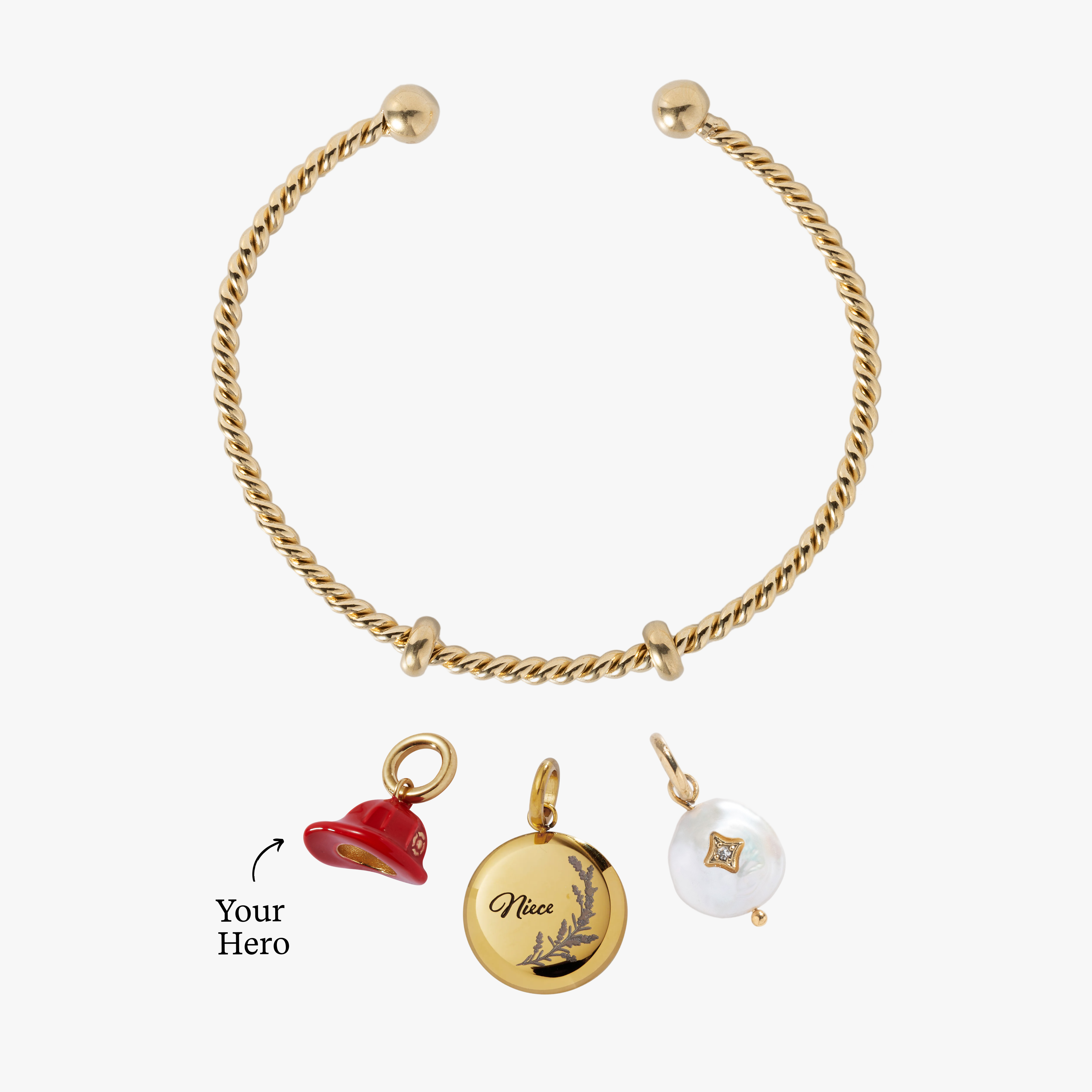 For the bold, the brave, and the ones who run toward the heat—this charm stack honors real-life heroes with a firefighter hat, pearl accent, and elongated family bar charm. Comes with a French Rope Charm Bracelet Cuff, free with your bundle.