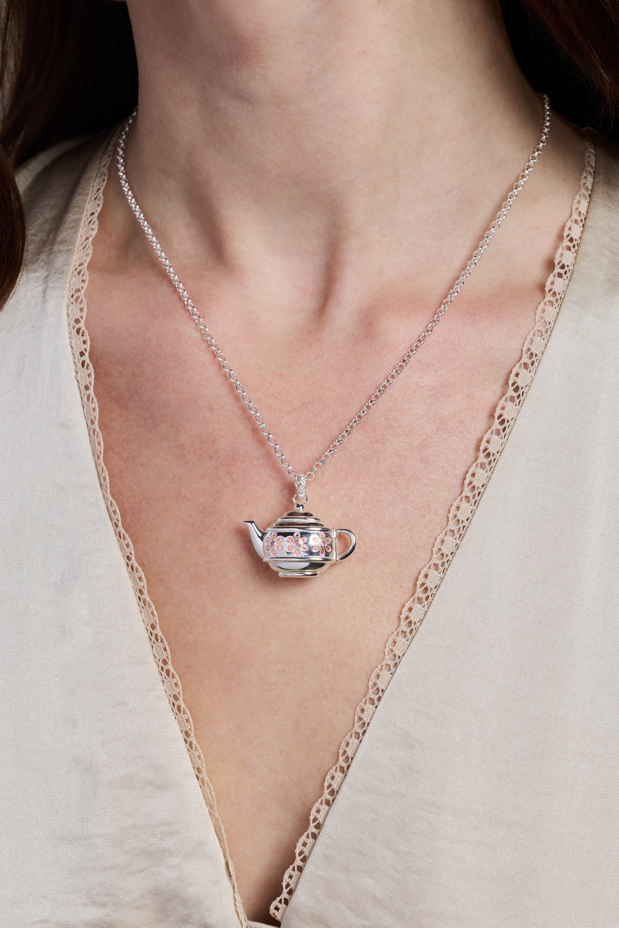 A charming nod to teatime traditions. This silver teapot pendant necklace features delicate pink floral details and opens to reveal a tiny tea bag hidden inside inscribed with "Have a cuppa." A sweet and whimsical piece that celebrates cozy moments and the simple joys of a perfectly brewed cup.