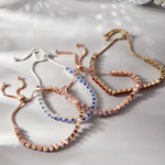Make a statement in deep blue. This sapphire-toned bracelet features radiant crystals along a sleek tennis chain and a slider for adjustable wear. A striking accent for any bracelet stack. Adjustable from 5" to 8".