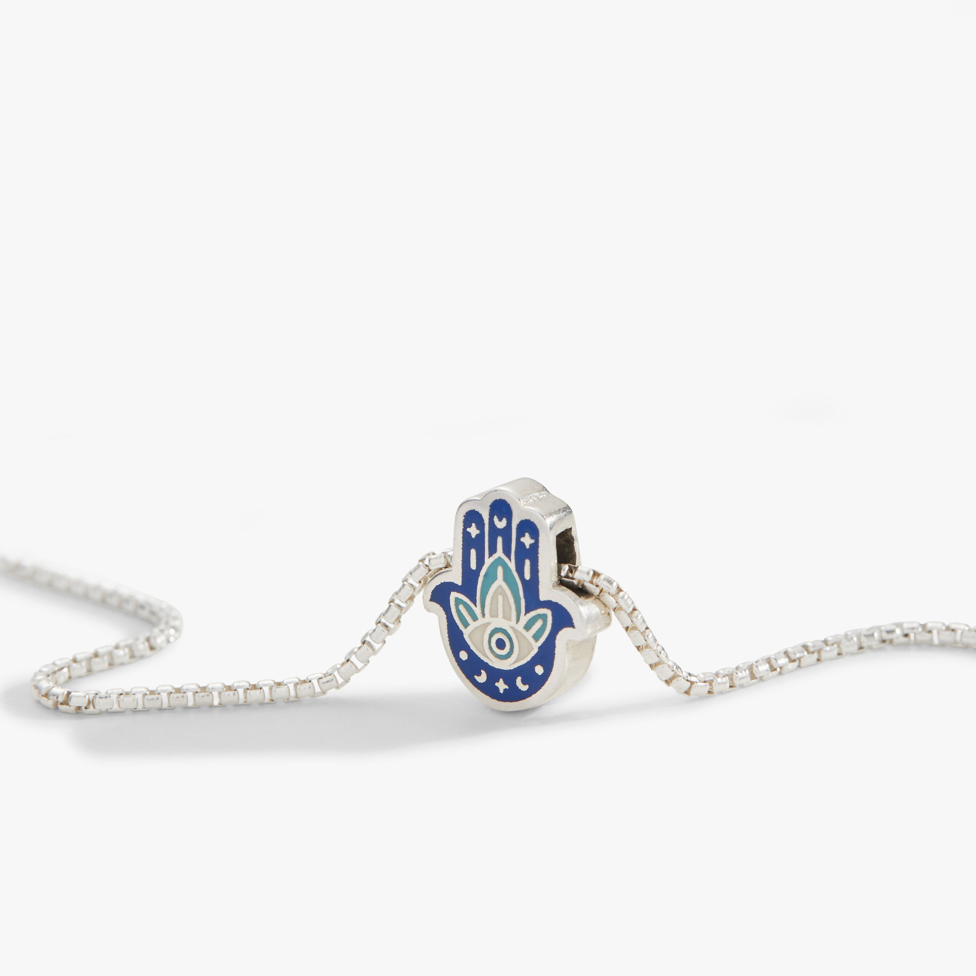 Layer on good vibes only with this Hamsa charm necklace. This blue hamsa symbol deflects all negative energy.