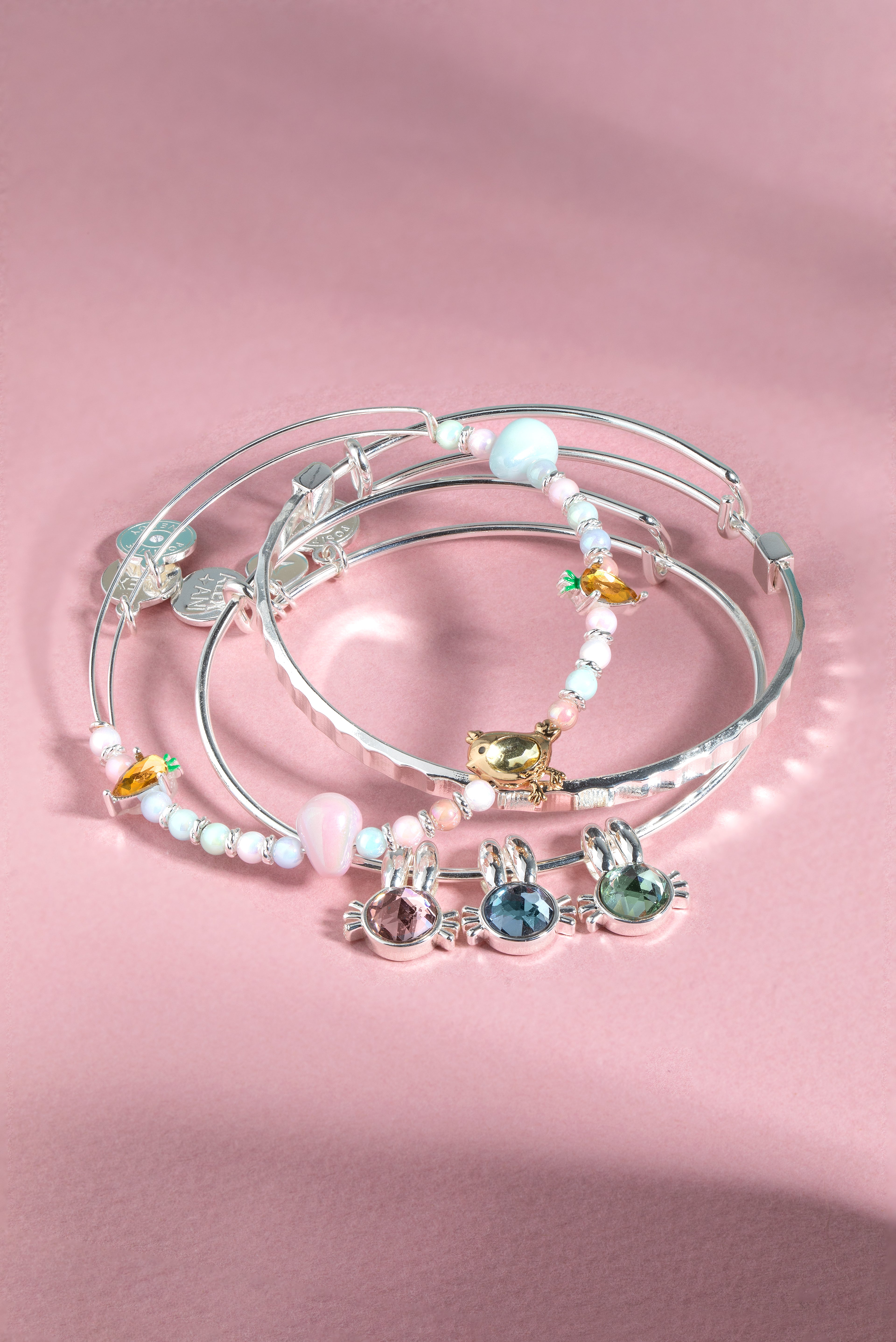 Celebrate everything sweet with this set of three Crystal Bunny expandable wire bracelets. One is a multi-charm bangle that features three bunny-shaped charms, each with a pink, blue or green crystal. One is a beaded bangle with crystal carrots and a baby chick, and two enamel egg charms, inline on a multicolored beaded bracelet. One is a tile-beaded accent bangle. Wear them to welcome the season — or gift them to somebunny you love.