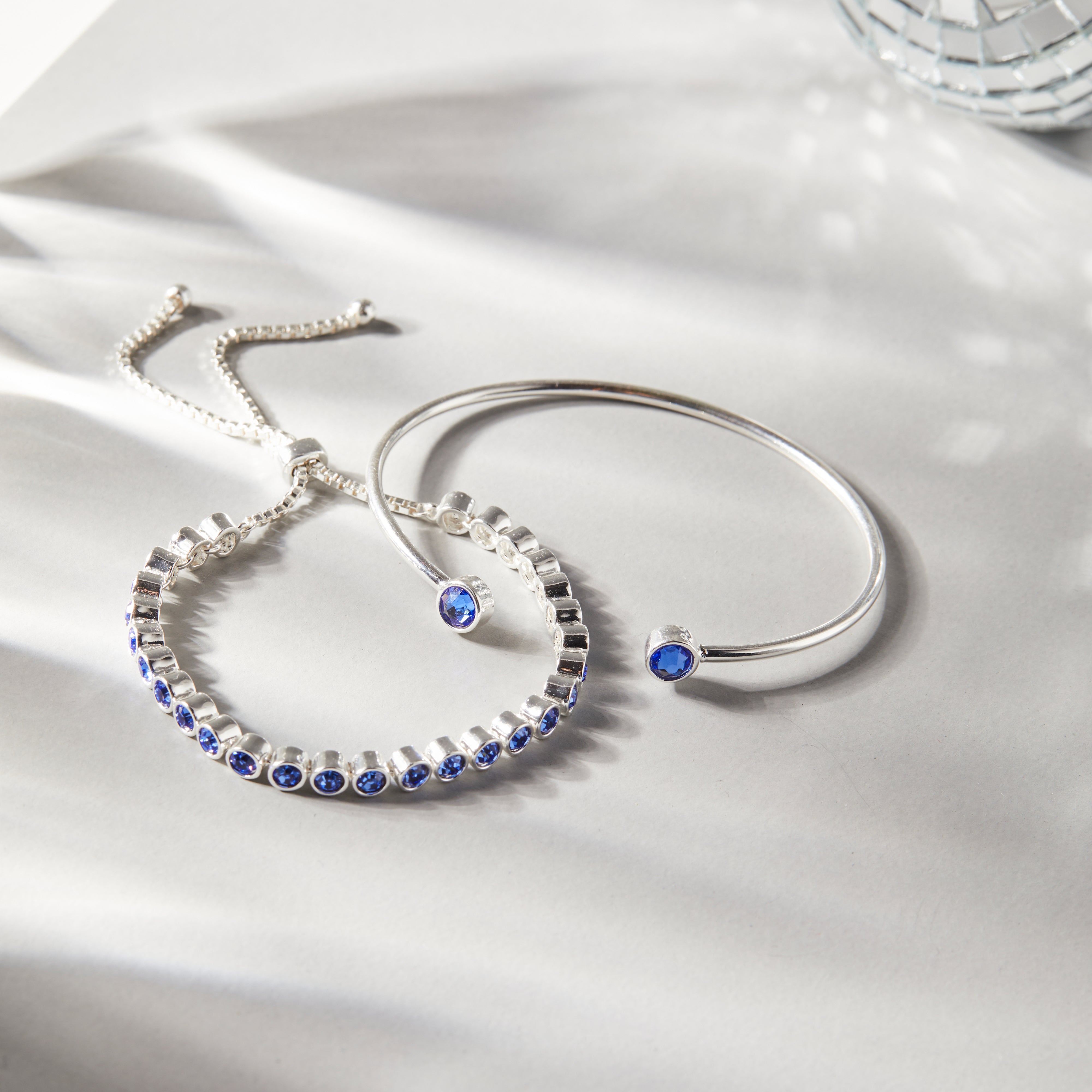 Make a statement in deep blue. This sapphire-toned bracelet features radiant crystals along a sleek tennis chain and a slider for adjustable wear. A striking accent for any bracelet stack. Adjustable from 5" to 8".