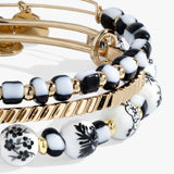 Hand-painted details, shiny gold finishes and intricate texture make this 3-piece set a must-have luxury. The Toile Beaded Bangle Set of 3 features a hand-painted toile floral-patterned bangle, a black and white glass beaded bangle and a shiny gold-textured bangle.