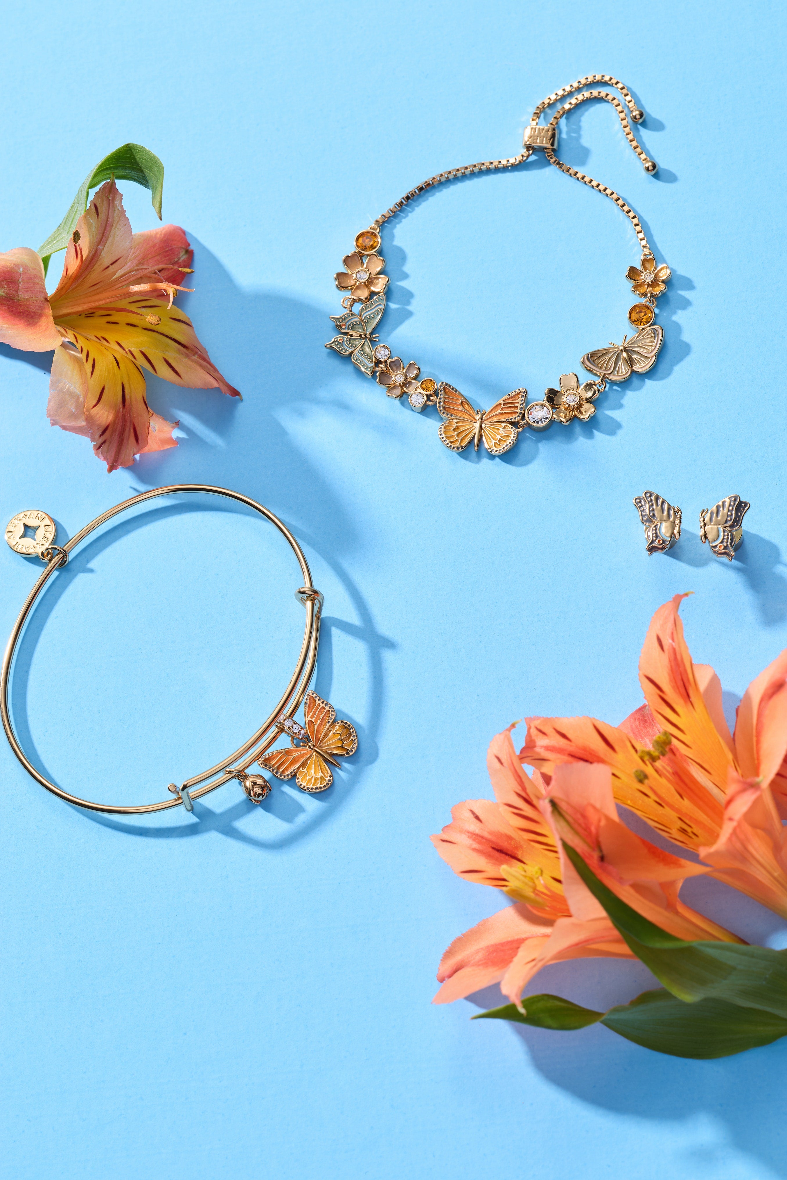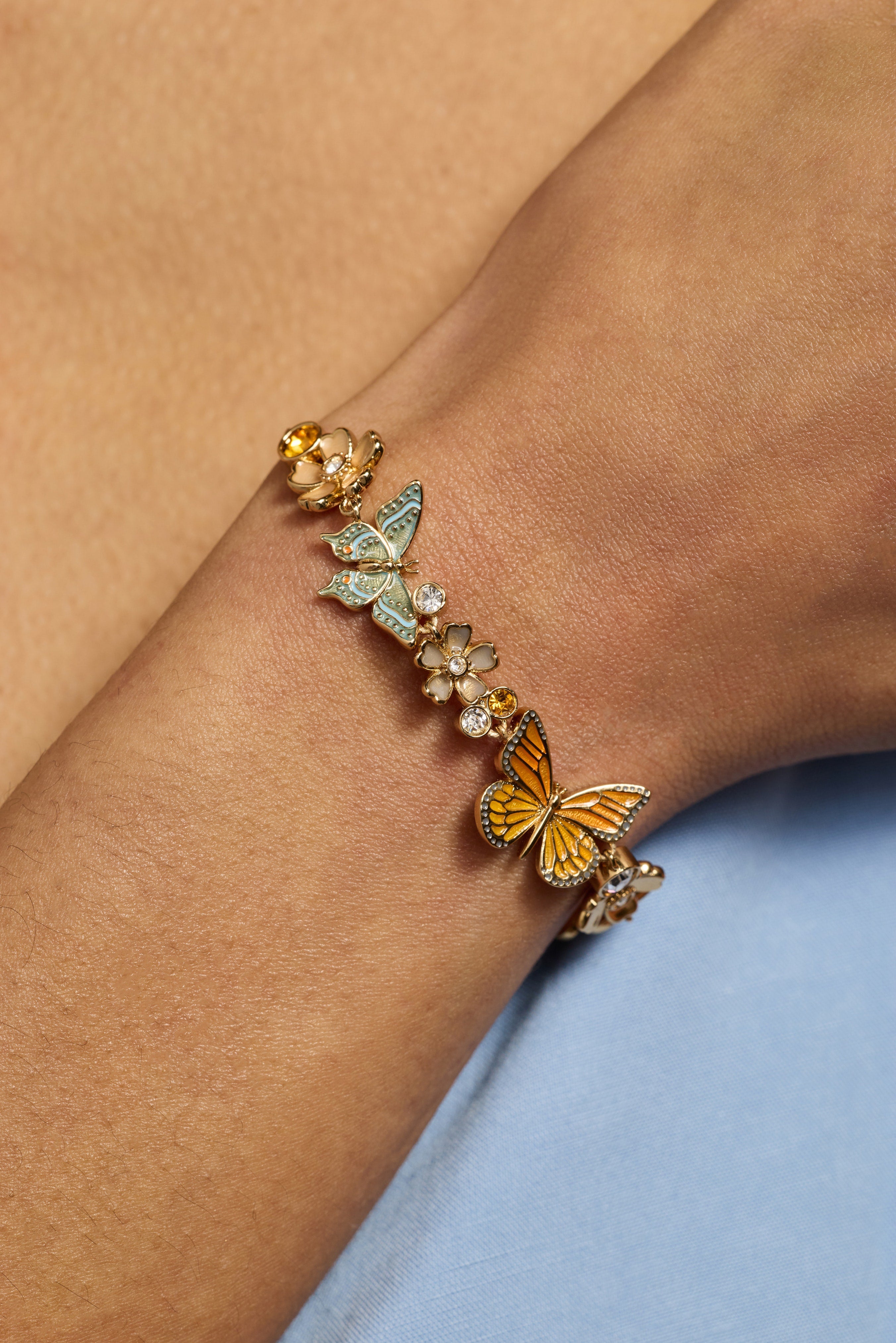 Celebrate nature's beauty with this inline charm bolo bracelet, inspired by the New York Botanical Garden®. Featuring vibrant blue and orange enamel butterflies that flutter across your wrist, complemented by dimensional flowers and sparkling stone accents. The adjustable bolo design offers a comfortable, personalized fit. A wearable garden that brings color and elegance to any moment.