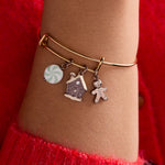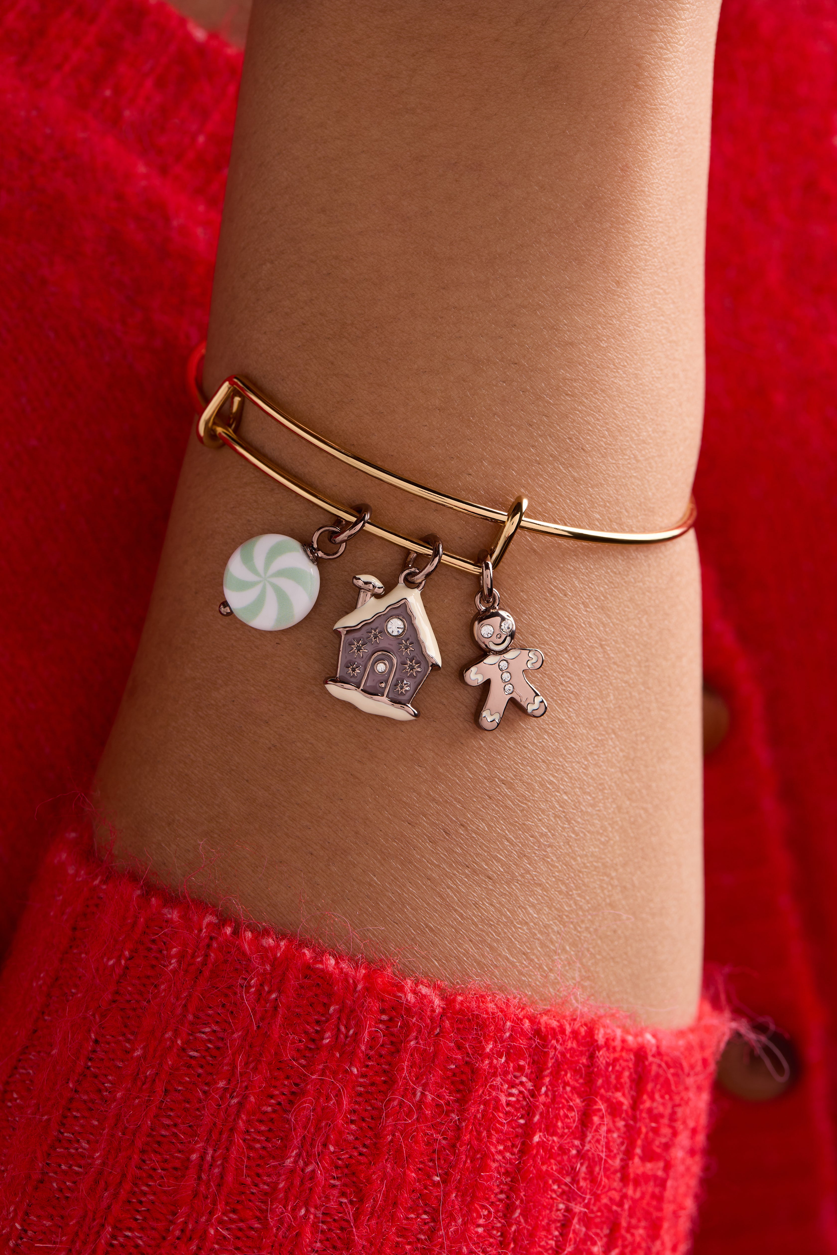 Celebrate the festive season with this playful charm bangle, specially designed to bring holiday cheer to your wrist. It showcases a vibrant green peppermint charm that adds a pop of color, paired with an adorable enamel gingerbread woman full of character. Completing the trio is a delightful enamel gingerbread house, enhanced with a sparkling stone that catches the light beautifully. This whimsical combination makes it the perfect accessory to spread joy and warmth throughout your holiday celebrations.