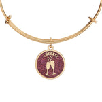Pop the cork on a new year! This Happy New Year Cheers Bangle features a pink glitter epoxy charm that says "Cheers!" with two clinking champagne glasses on an expandable wire bangle. Wear it to ring in the new year in style.