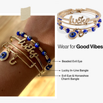 Manifest luck and positivity with this evil eye set of three bracelets. An adjustable cuff says "Lucky," while an expandable wire bangle has evil eye beads interspersed with gold-tone beads. Another expandable wire bangle features an evil eye charm and a horseshoe charm, both accented with clear crystals. The evil eye is said to ward off negativity. Make space for good things to come your way.
