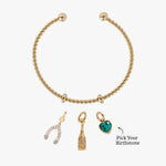 Turning 21 calls for something extra special. This bundle features a champagne charm, a wishbone for luck, and a customizable birthstone charm—choose your birthday month or a shade that fits your vibe. Comes with a French Rope Charm Bracelet Cuff, free with your bundle.