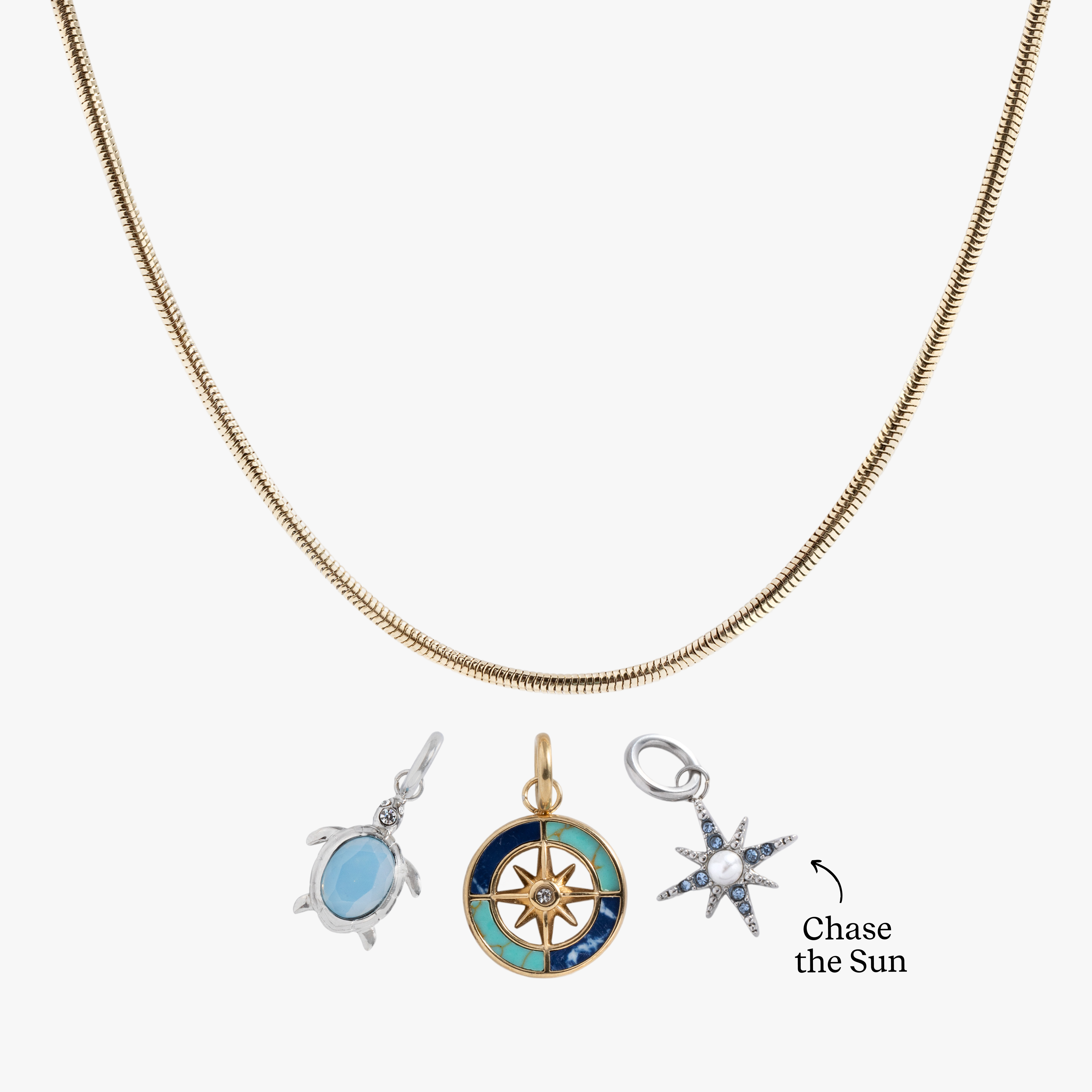 Inspired by sun, sand, and spontaneous road trips, this trio of beachy charms channels salty air and carefree energy. Includes a compass, sea turtle, and starburst charm for ocean-loving souls. Complete the look with a necklace base—just $10 to upgrade your stack.