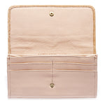 Sturdy and multifunctional, it features a leather zipper pull fringe, a snap closure on the flap, interior dividers with card slots, and a back zip pocket for change.