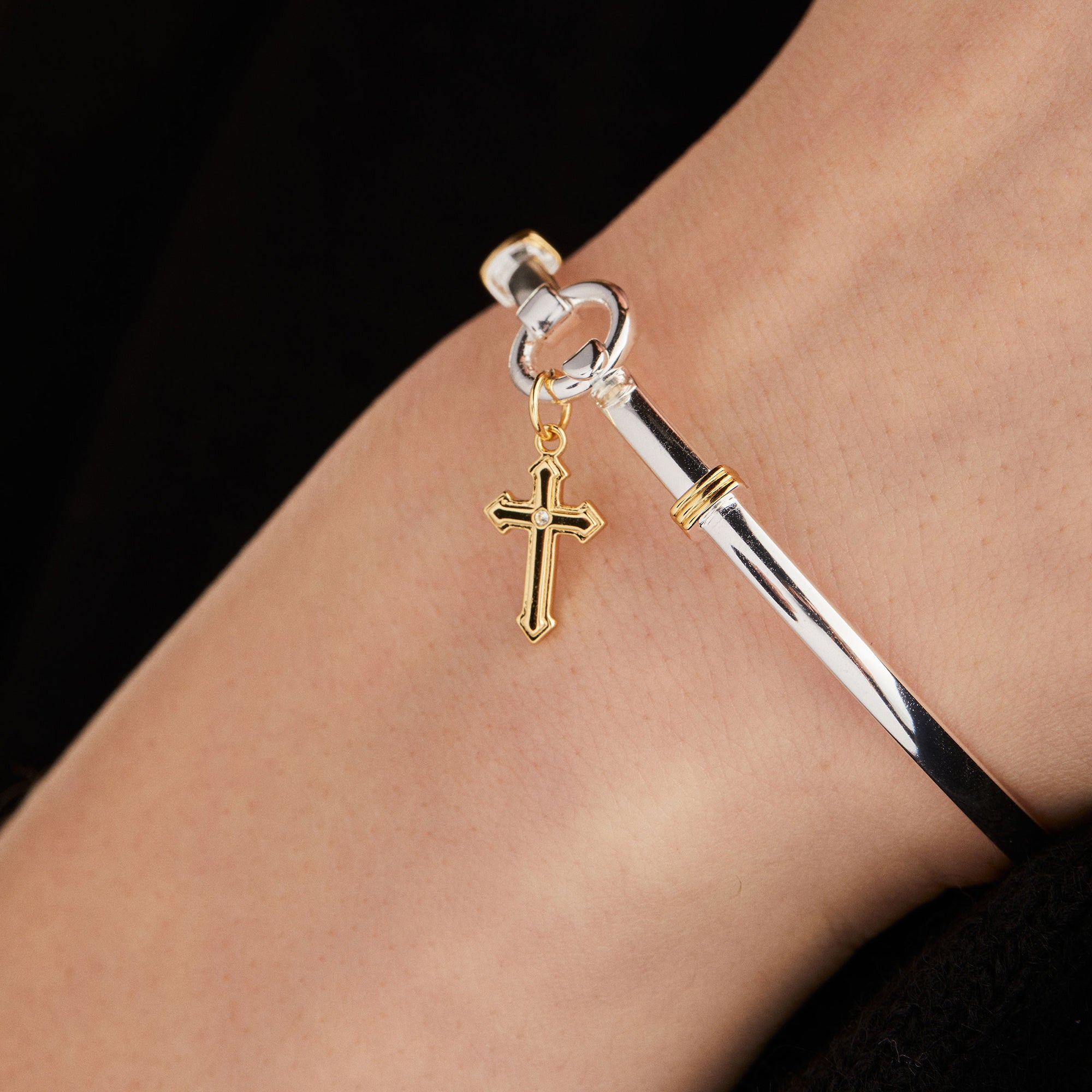 Grounded in faith, elevated in design. This two-tone bangle features a detailed cross charm on our sleek tension-clip silhouette for easy wear. A meaningful expression of belief, beautifully crafted with an elevated touch of contrast.