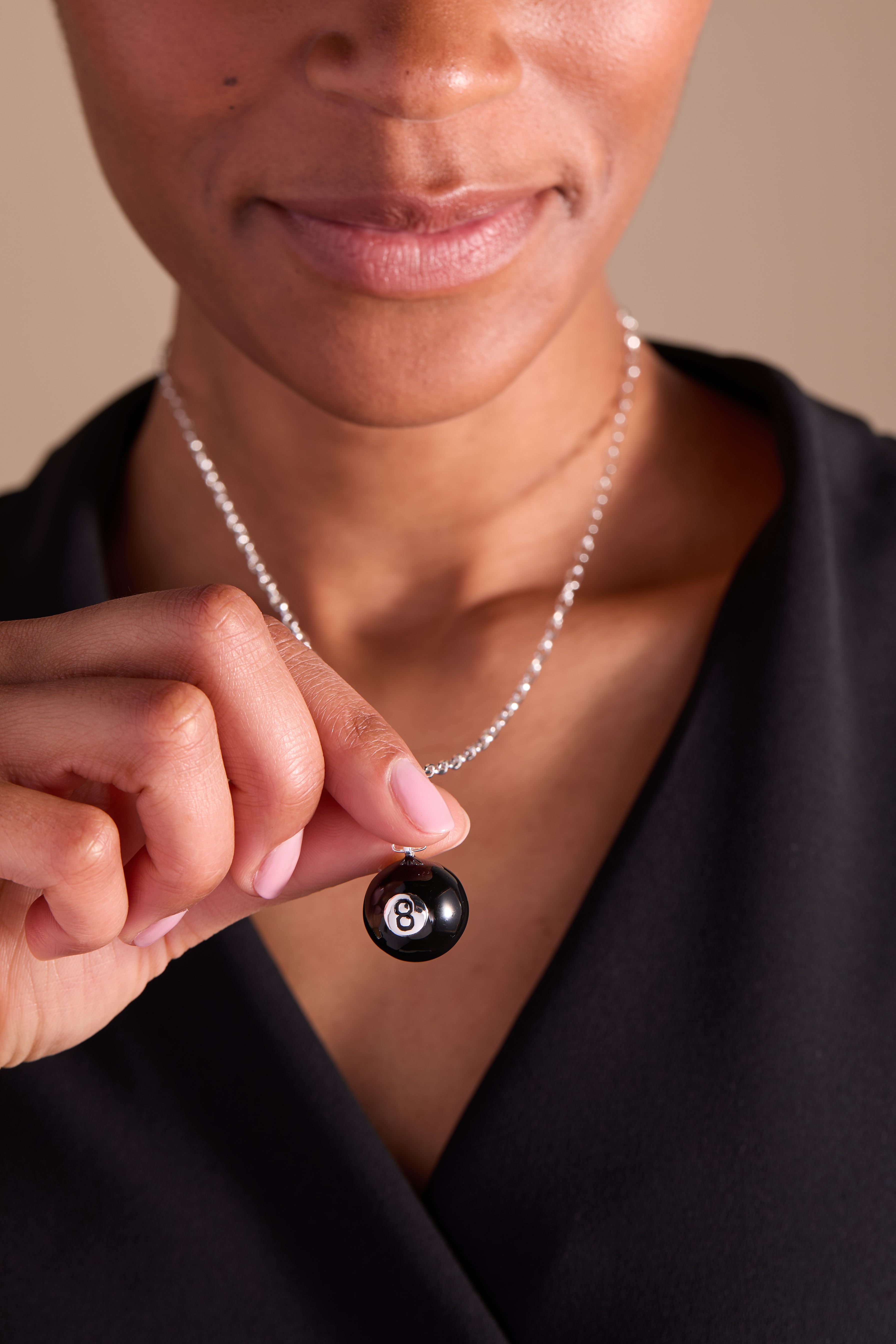 Take a chance on something bold. This playful necklace features a 3D Magic 8 Ball pendant with a spinning triangle that reveals one of two classic answers: “Don’t Count On It,” and “Signs Point To Yes” The enamel and crystal design adds a nostalgic sparkle, framed in a pave crystal border and suspended from a lightweight paperclip chain. Wear it solo or layer it up—either way, the outlook is good.