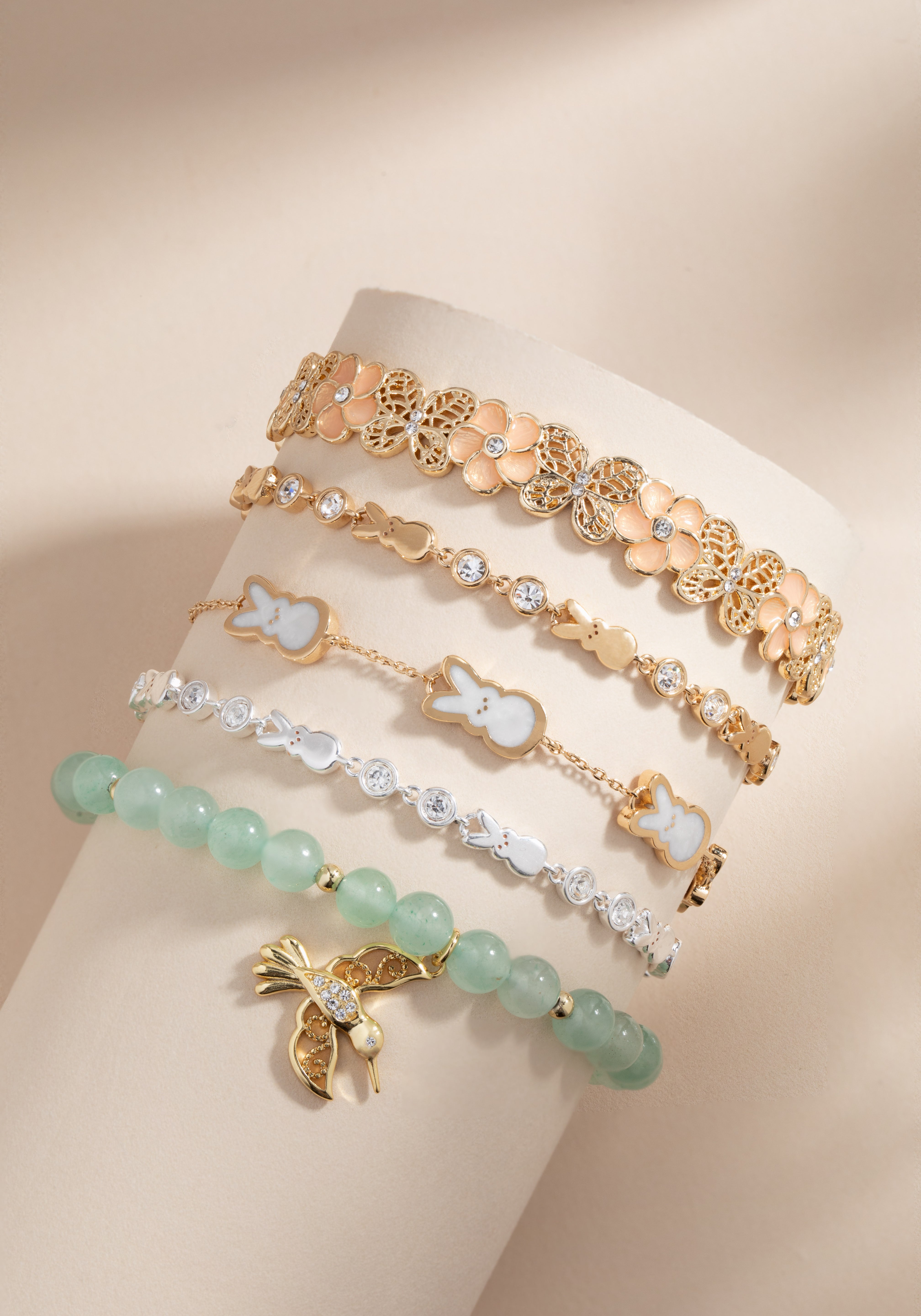 Celebrate everything sweet about springtime and Easter with this PEEPS® Pearlized Bunny Charm Bracelet, which features pearlized PEEPS® bunny charms inline on an adjustable-length chain bracelet. Wear it to welcome the season — or gift it to somebunny you love.