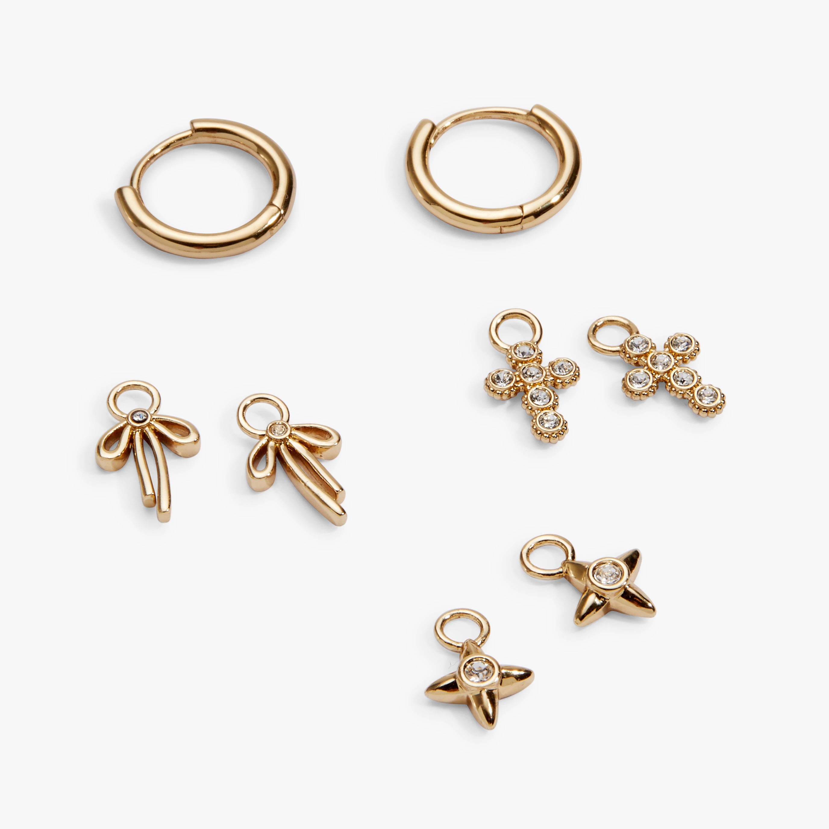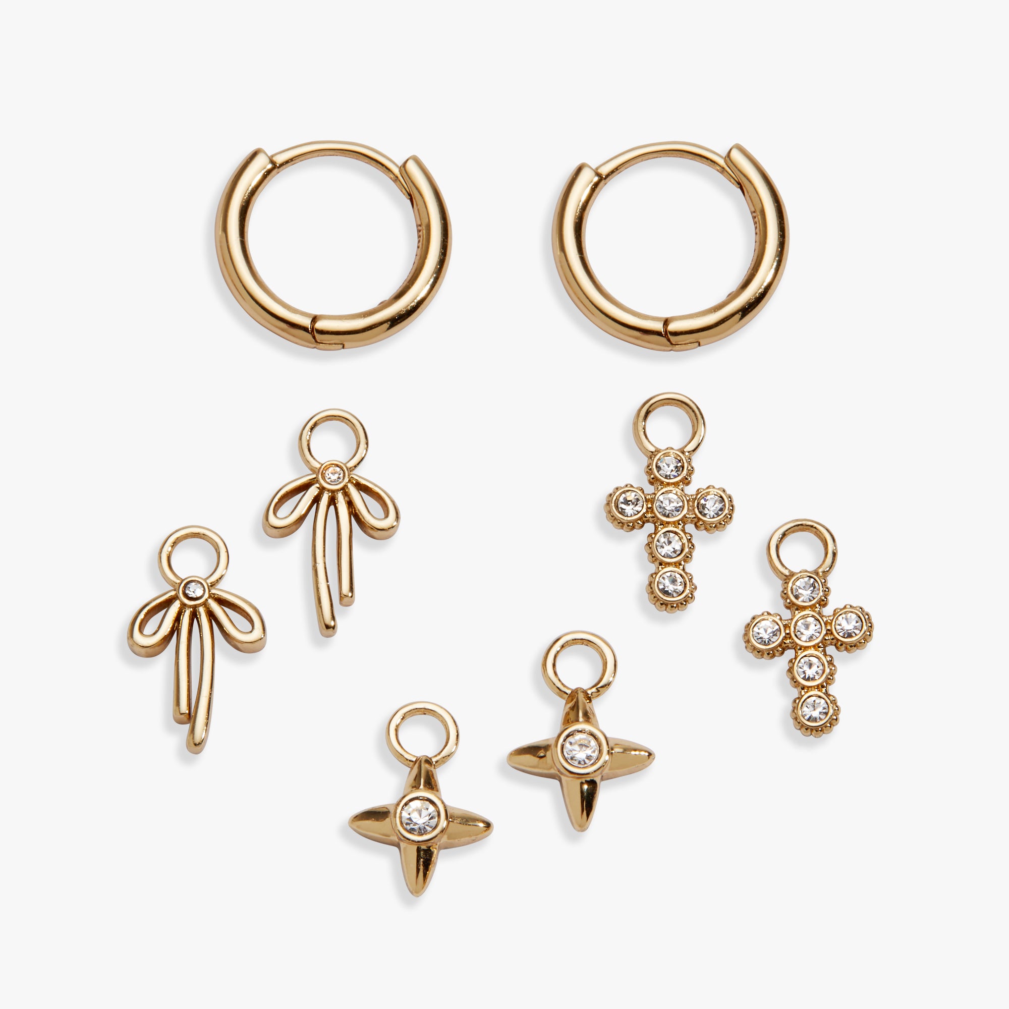 Adorable huggies that let you switch up your vibe with interchangeable charms—sparkly crystal cross, charming metal bow, and signature logo star. Mix and match to match your mood, or wear them solo for understated elegance. The perfect way to keep your ear candy collection fresh and fun.