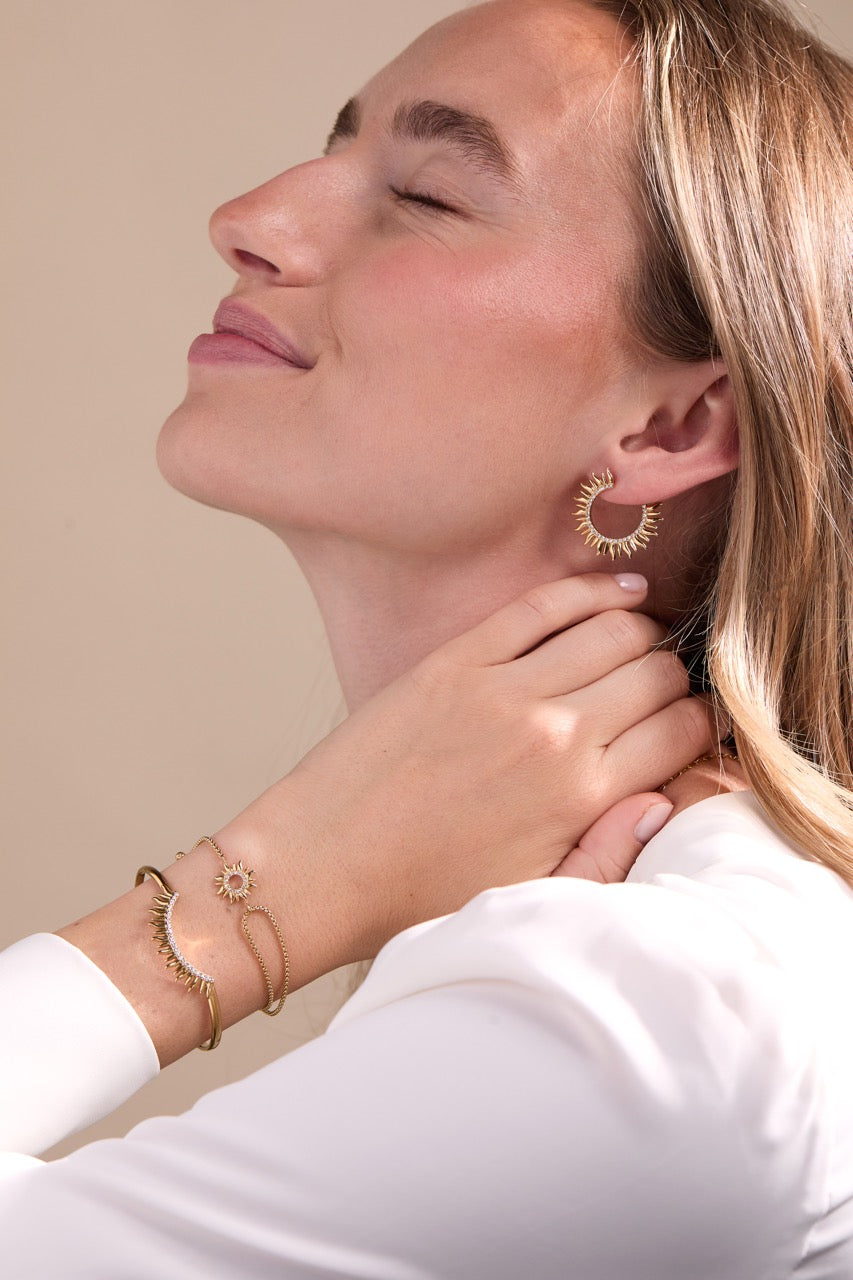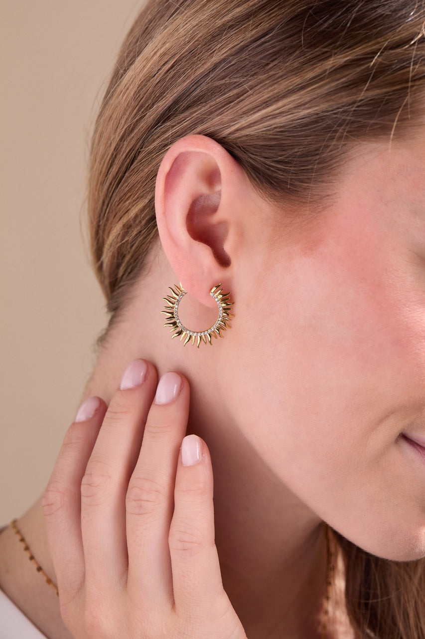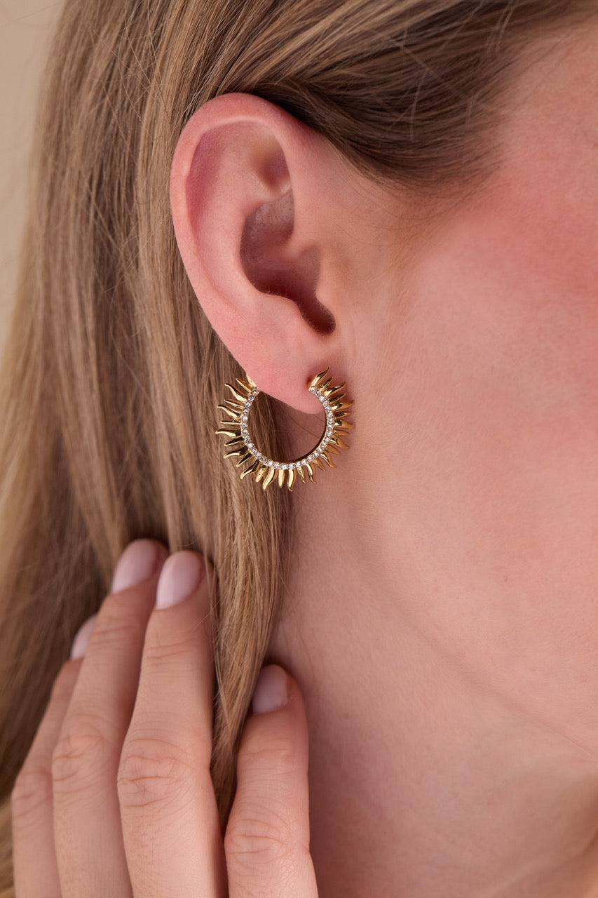 Let your style shine from every angle with these sunray-inspired front-to-back hoop earrings. Crafted from stainless steel and finished with a burst of beveled sunbeams, this statement silhouette is set with a shimmering line of clear crystals along the front curve. Designed for lightweight comfort with a sleek surgical steel post, these radiant hoops embody the bold, bright energy of endless sunshine.