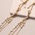 This charming bracelet includes three strands: a "daughter' nameplate strand, a pearl strand, and a fun dimensional heart strand, etched on the back with the phrase "Home is where the heart is."