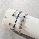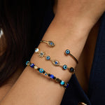 This gold-plated flex cuff shines with a playful spirit. On one side, an etched evil eye shines with clear and sapphire crystals, surrounded by spiked edges resembling eyelashes. The other side features a bezel-set glass evil eye cabochon, adding a fun and sparkly touch. Designed for those who value meaning, the Evil Eye represents protection, strength, and empowerment. Perfect for stacking or rocking solo, it brings both color and charm to any bracelet collection. Pair it with matching styles for added power!