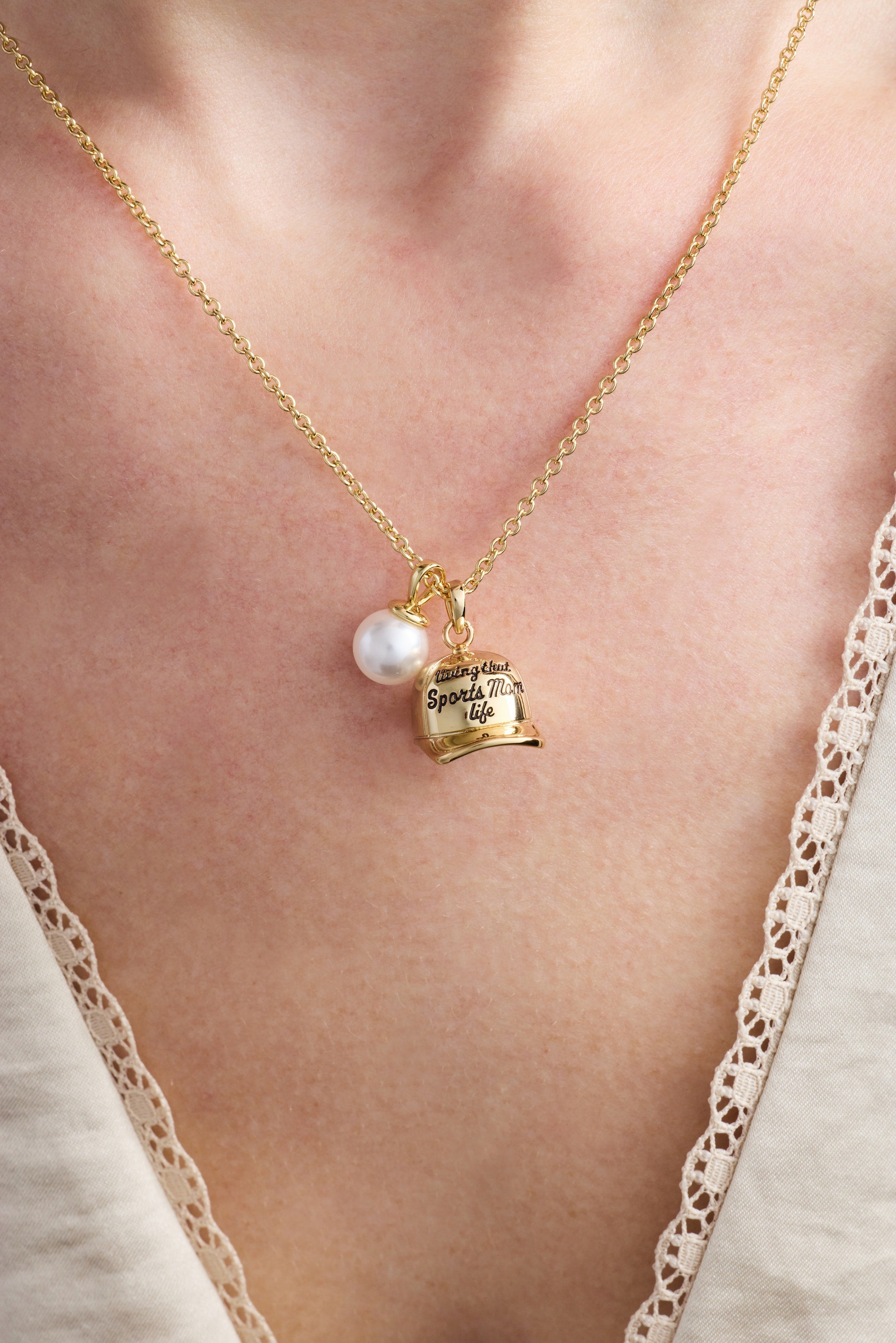 Celebrate the sports mom in your life with this charming gold-plated necklace. Featuring a dimensional baseball hat charm engraved with "Living that sports mom life" and a delicate pearl drop, this double charm design captures the spirit of sideline dedication. The cable chain offers timeless elegance, making it the perfect Mother's Day gift for the woman who cheers loudest in the stands.