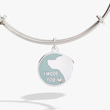 Dogs are our best friends, and so much more. This bracelet features an enamel charm with a dog silhouette, which says "I woof you," on an expandable wire bangle. Wear it to keep your favorite pets close, or gift it to your favorite dog lover.