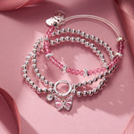 Show love, support, strength and solidarity with this Breast Cancer Awareness Butterfly stretch bracelet. This bracelet features two rows of shiny silver beads, ending at a shiny silver ring that has two charms. One is a clear crystal accent charm, and the other is a dimensional pink enamel butterfly charm that has the Breast Cancer Awareness ribbon on the front and has “hope strength and love” etched on the back.