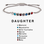 She knows you love her, but spell it out with this Daughter Adjustable Bolo Bracelet, which holds a secret: each crystal stands for a different letter in "daughter." D is for diamond, A is for aquamarine, U is for uvite tourmaline, G is for garnet, H is for hematite, T is for turquoise, E is for emerald and R is for ruby, all on a bolo bracelet that adjusts to comfortably fit her wrist. It's a secret message just for her, from your heart.