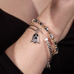 Get ready for some ghostly fun with this Halloween charm bangle! Featuring a twisted wire design and a silver ghost charm with "Here for the Boos" printed on the back, this bracelet adds a playful, spooky touch to your fall style. Perfect for showing off your Halloween spirit with a wink!