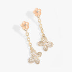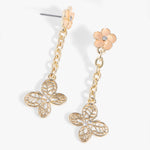 Layer on a peachy state of mind with the beautiful Filigree Butterfly Drop Earrings. These dangling earrings feature a crystal-centered, translucent peach epoxy flower stud with an intricately detailed filigree butterfly at the end of a shiny gold chain.
