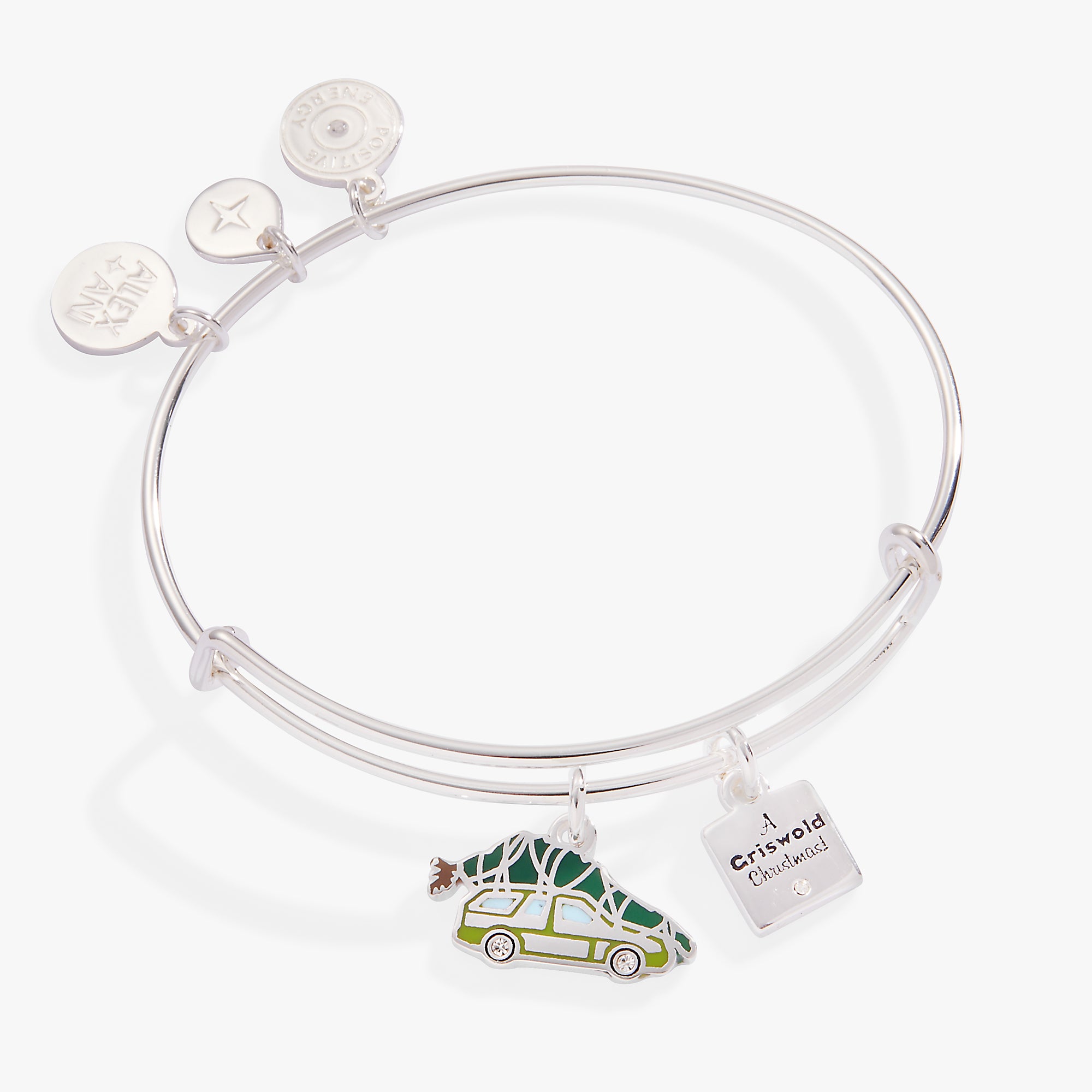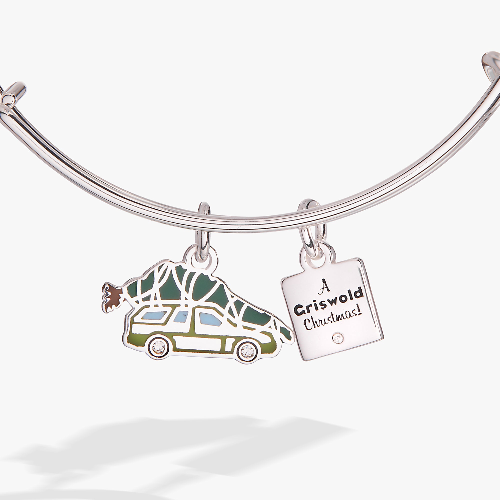 Keep the holidays funny with this NATIONAL LAMPOON'S CHRISTMAS VACATION™ 'A Griswold Christmas' Duo Charm Bangle. This bracelet features two charms: a buffed epoxy charm with the Griswold station wagon with an enormous tree tied to the roof, and a charm that says “A Griswold Christmas!” with a clear glass crystal accent on an expandable wire bangle. Wear it for the hap-hap-happiest Christmas yet.