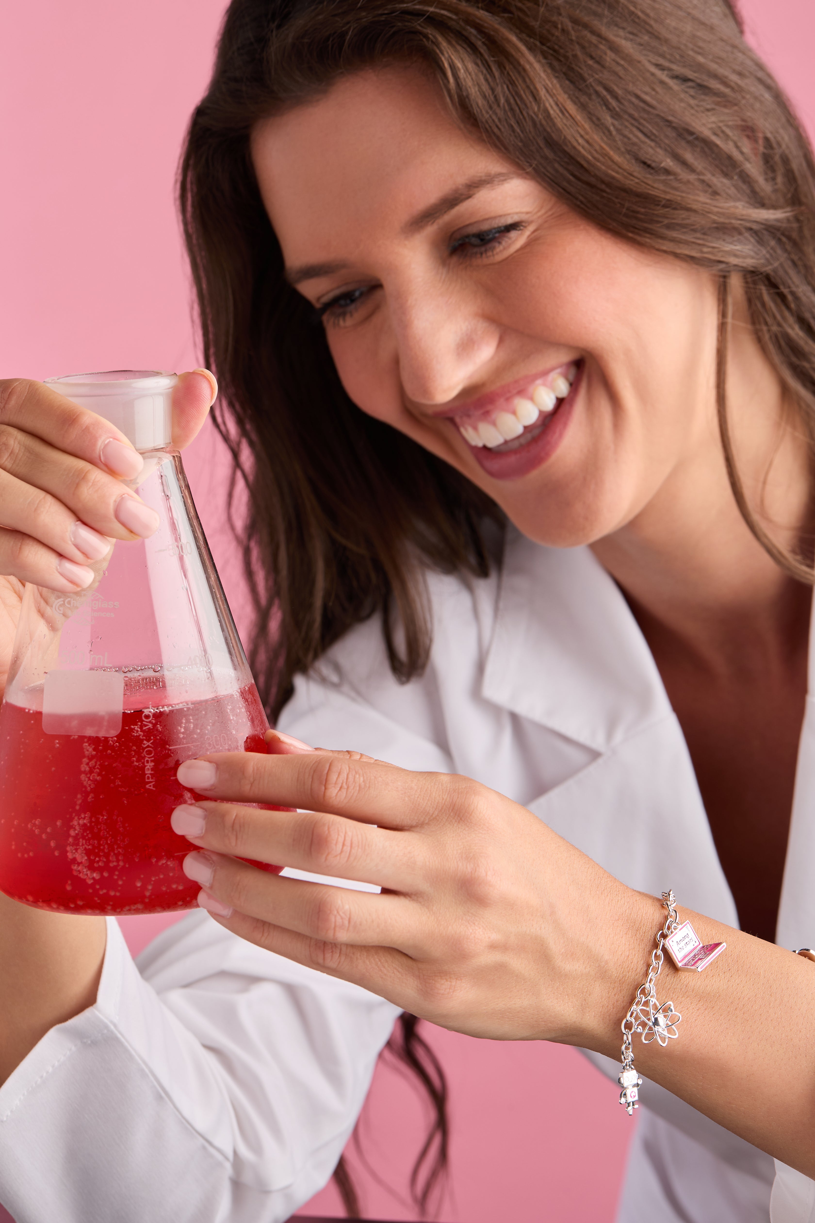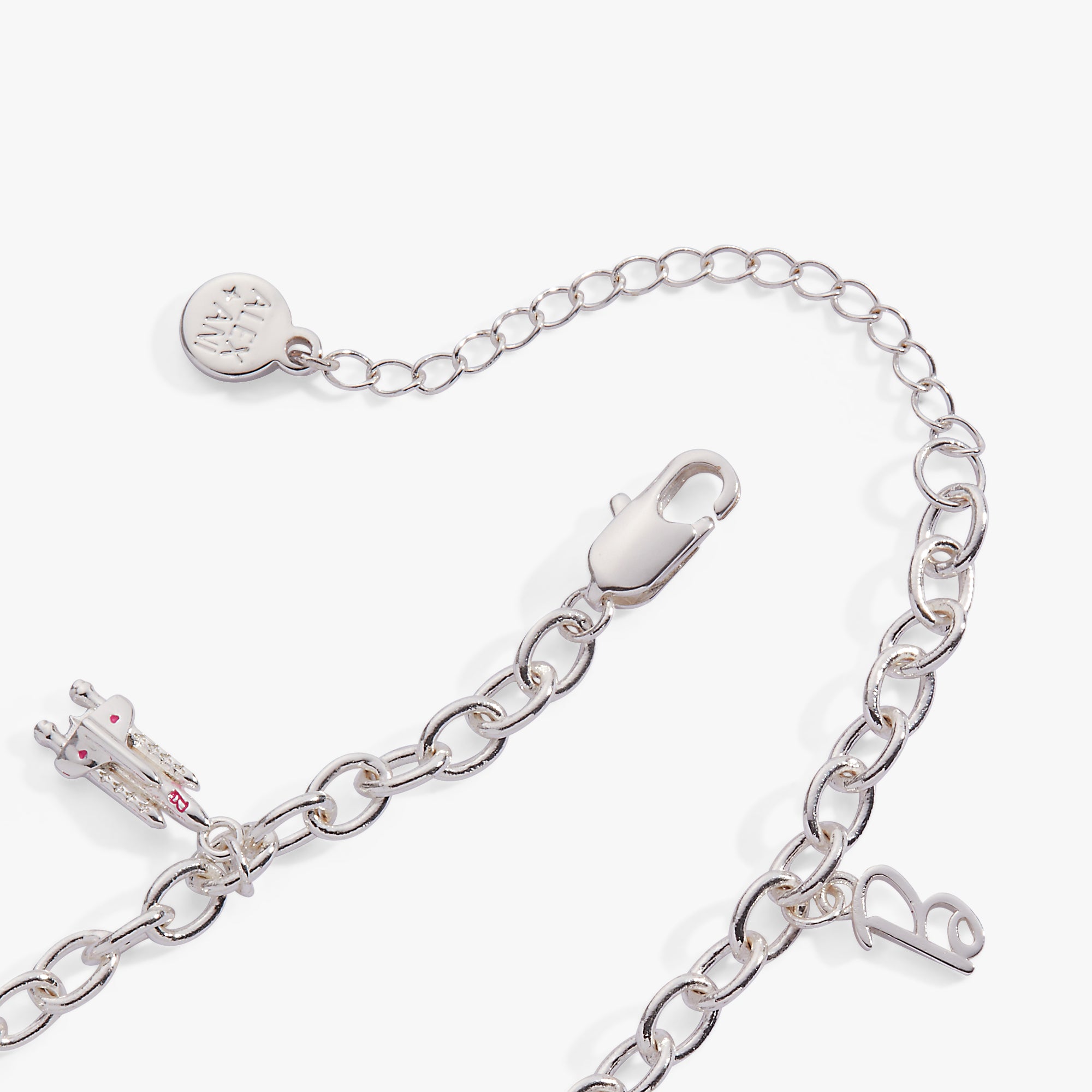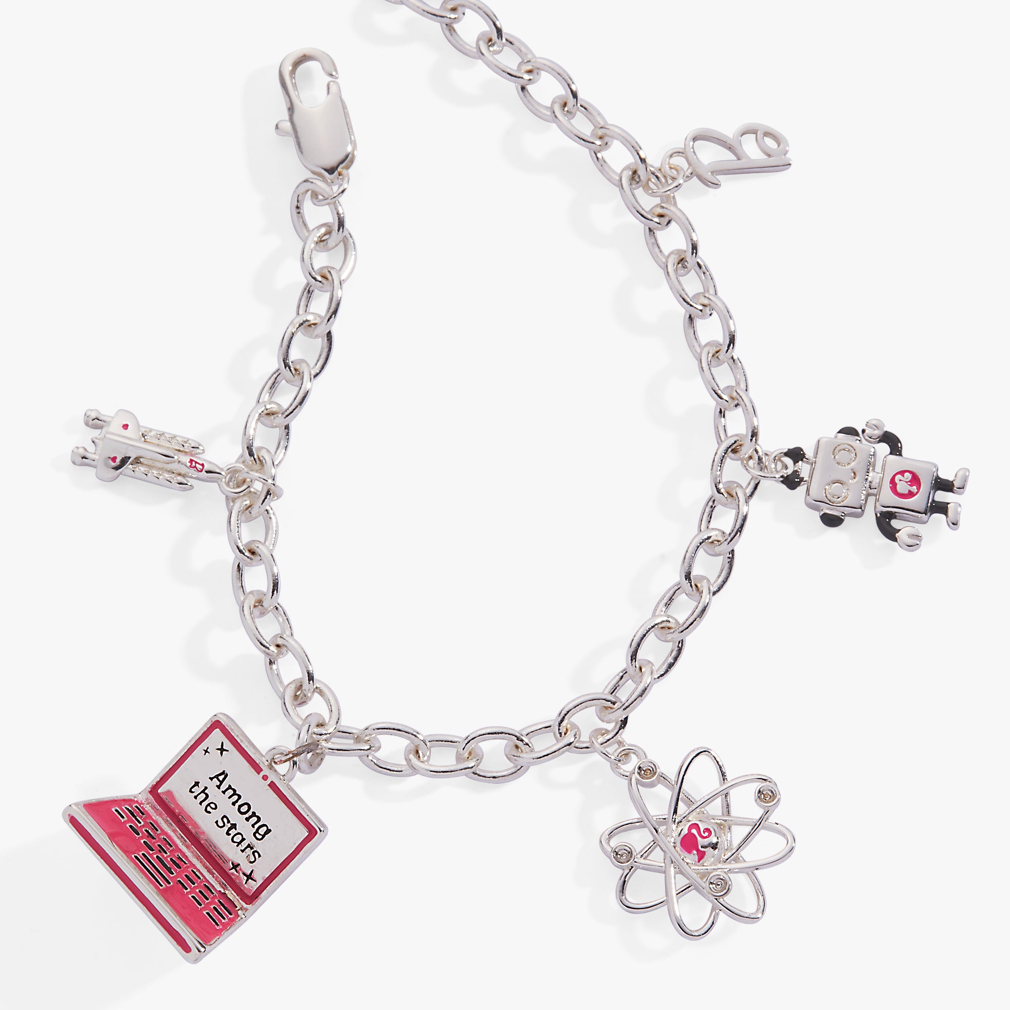 Celebrate girl power and cosmic ambitions with this Barbie™ STEM Charm Bracelet, designed to inspire the innovators and dreamers in your life. This iconic bracelet features five dimensional charms that bring STEM to life: a sleek rocket ship ready for launch, a vibrant atom symbolizing scientific discovery, a clever robot representing technology and innovation, the iconic Barbie "B" logo, and a laptop engraved with "among the stars"—a reminder that the possibilities are limitless. Charms are beautifully detailed with pink and black enamel accents that capture Barbie's signature style. Strung on a classic chain bracelet, it's the perfect accessory for celebrating curiosity, creativity, and the courage to reach for the stars.