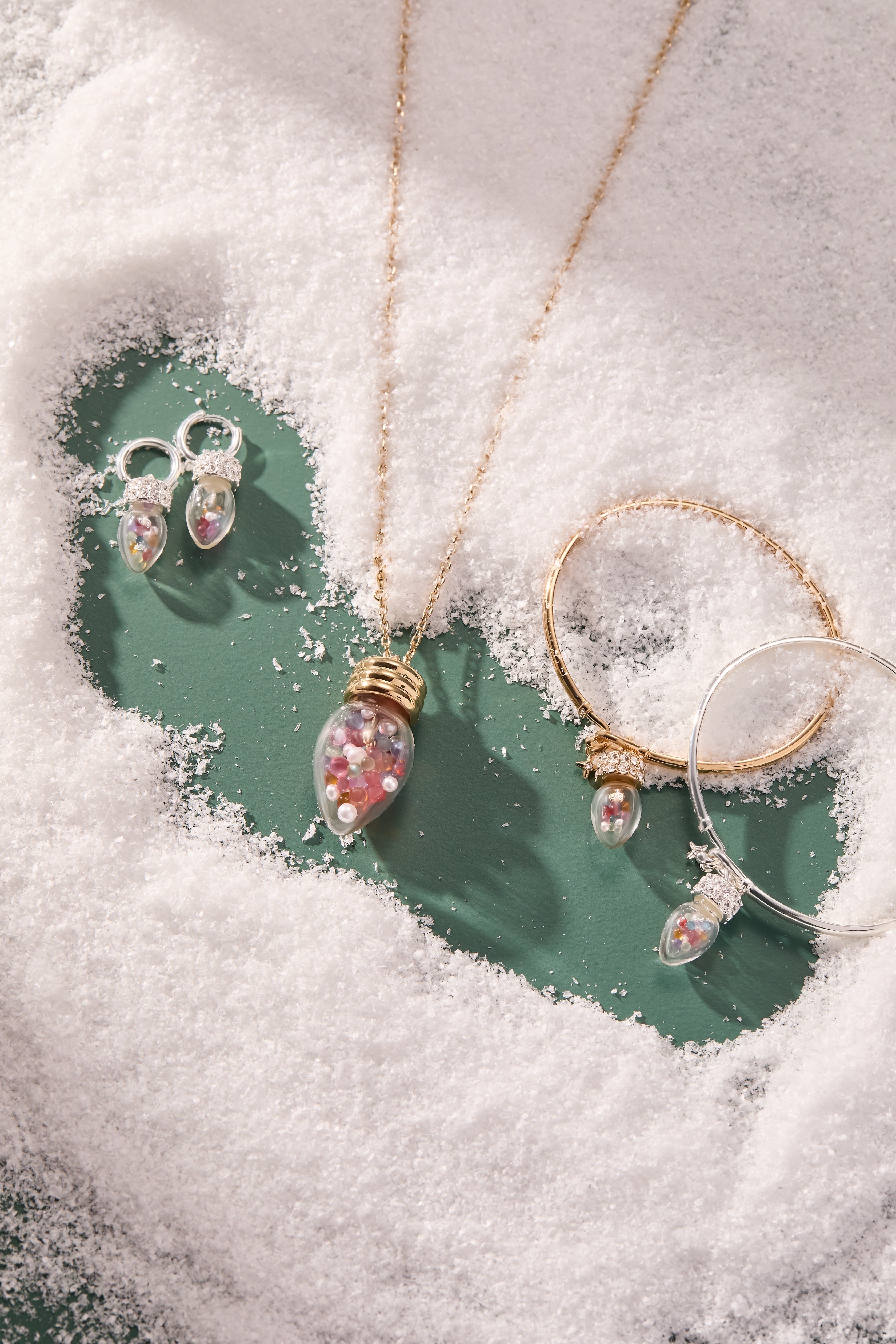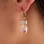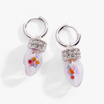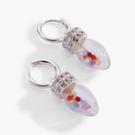 Brighten up your accessory game with these playful Light Bulb Shaker Earrings. Each earring showcases a clear light bulb charm filled with tiny colorful beads that dance and rattle with every movement, adding a lively sparkle to your style. The charm is easily removable from the huggie hoop, allowing you to switch up your look from quirky and fun to sleek and simple in seconds. Perfect for those who love a touch of whimsy and versatility in their jewelry collection. Let your personality shine with these charming, eye-catching earrings!