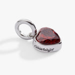 This charm features a sparkling, faceted garnet-colored heart-shaped stone representing January, set securely in a bezel with a star-shaped cutout of our logo on the back. The word "Courage" is etched along the side, making it a fun and meaningful addition. Perfect for adding a playful splash of color and personality to your bracelet or necklace stack.