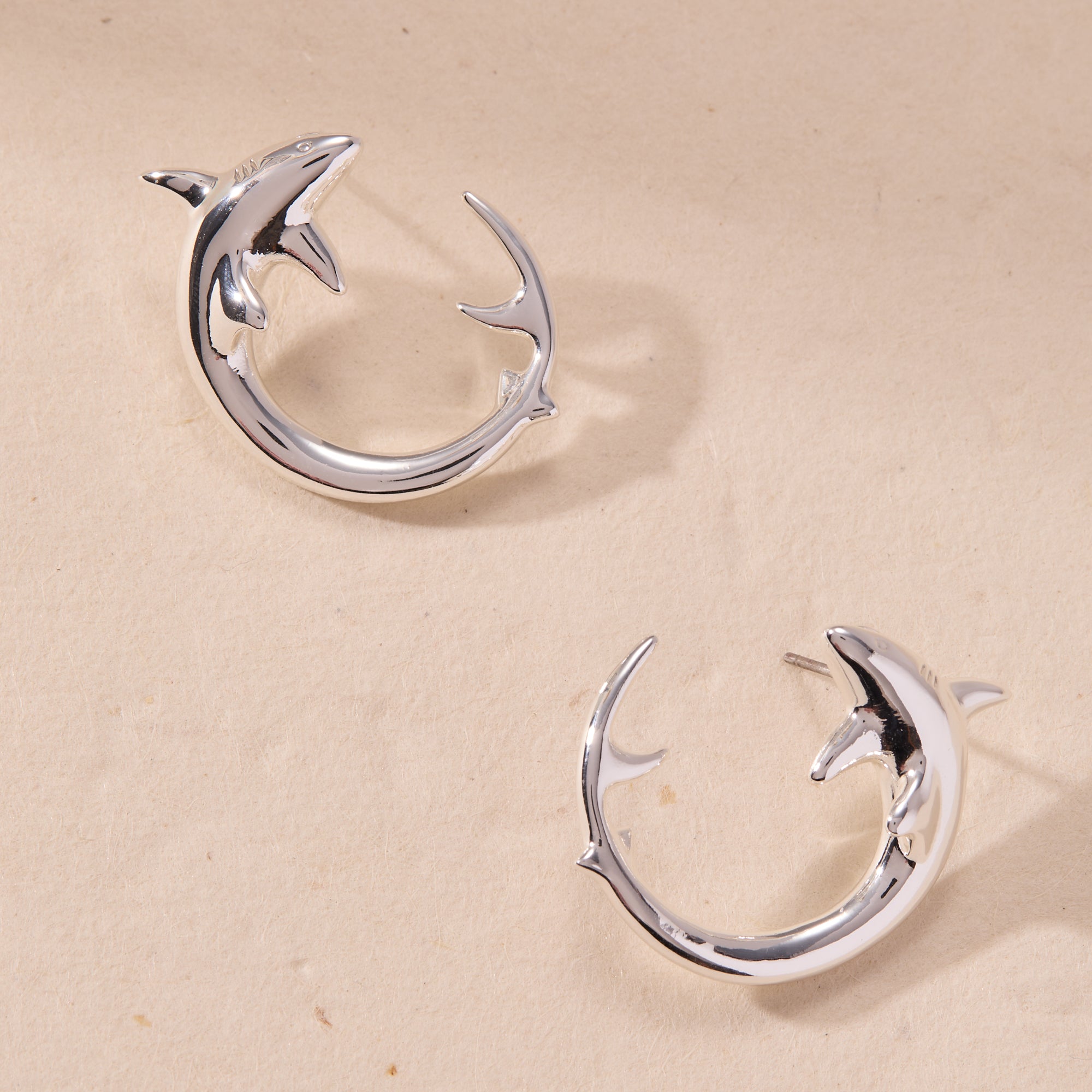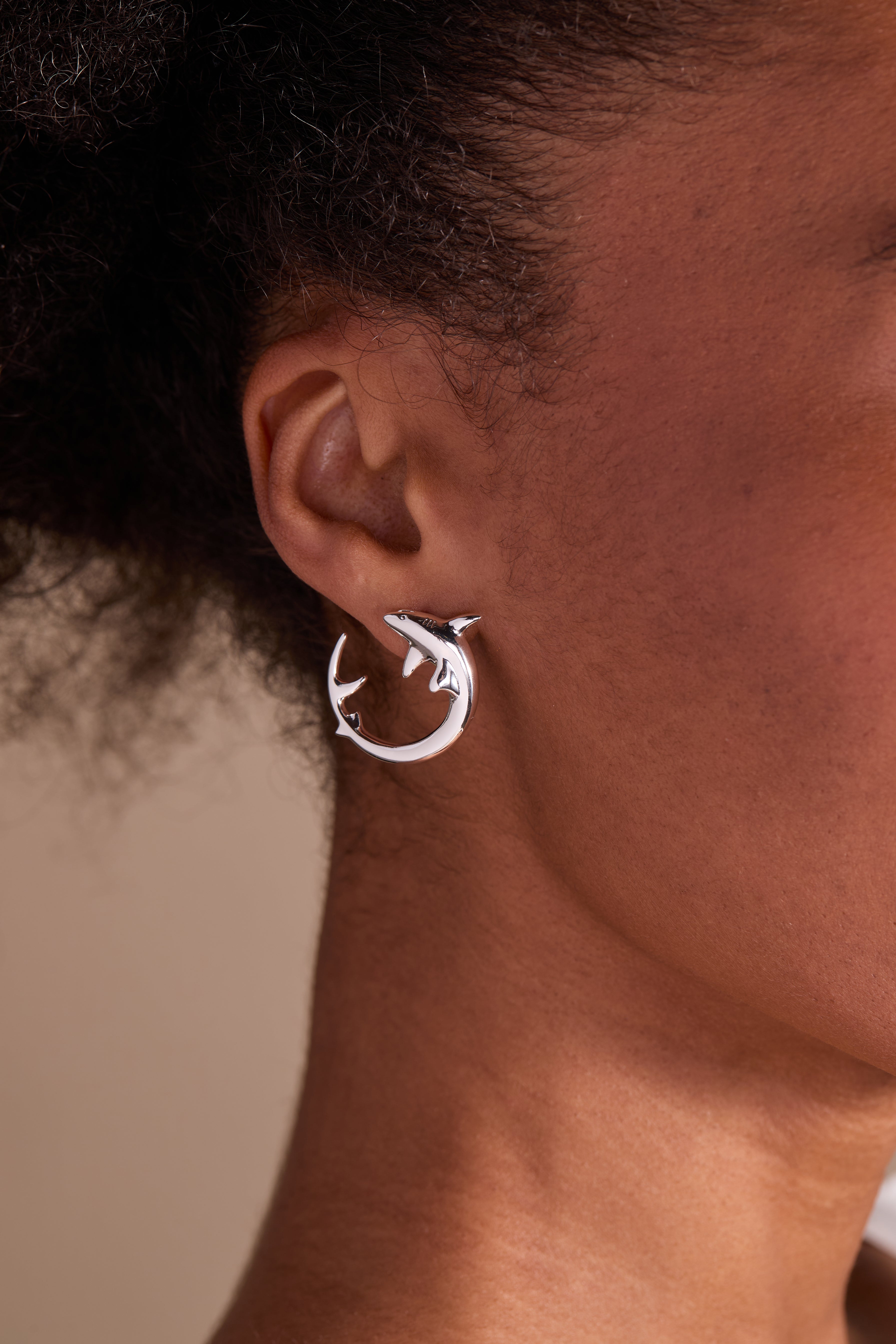 Bold, sleek, and a little bit fierce. These stainless-steel hoops wrap a shark’s body around your ear for a sculptural, statement-making look that’s equal parts cool and coastal.