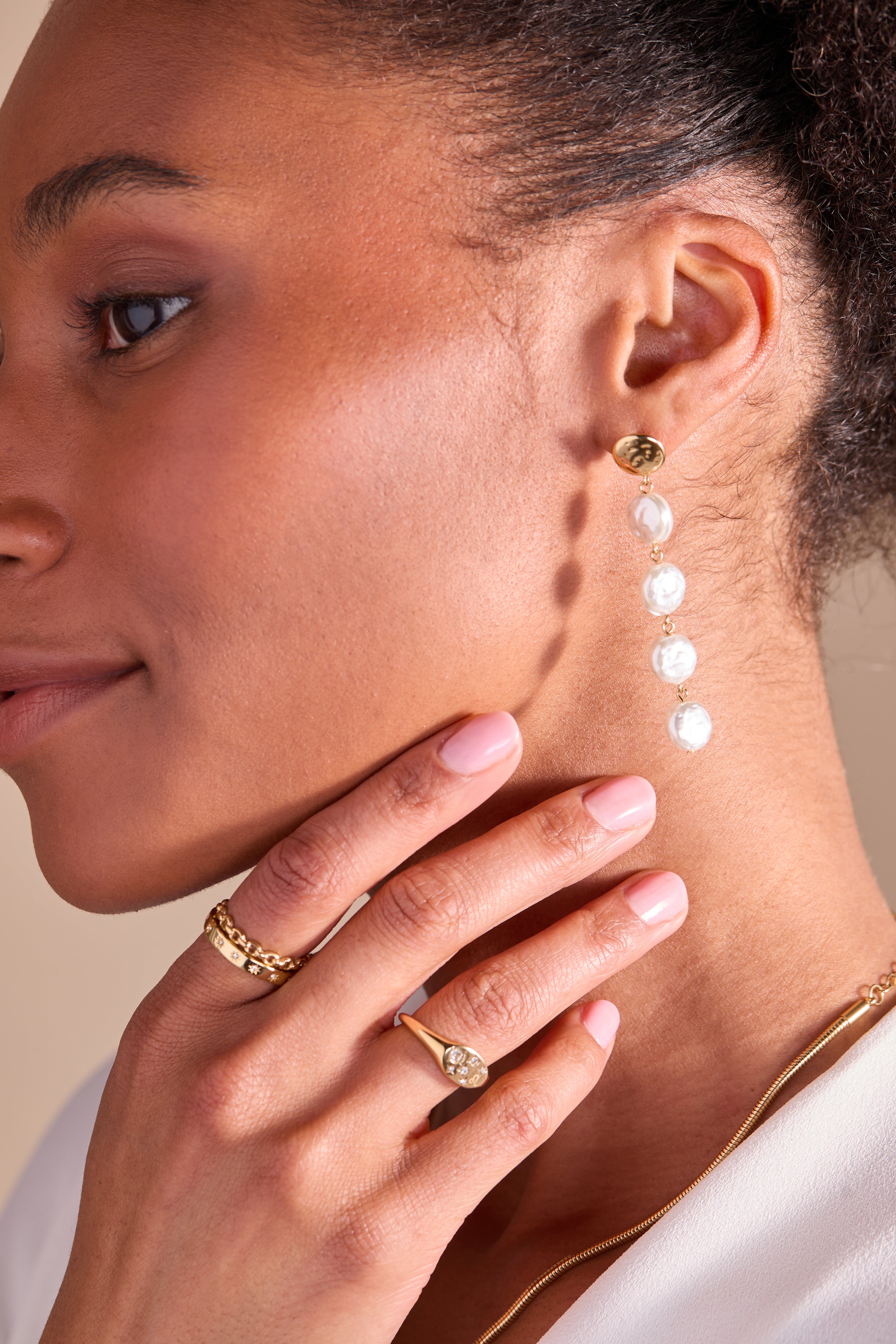 A strand of cool, effortless elegance. These linear drop earrings string together organic-shaped freshwater pearls with gleaming gold-tone accents, giving you that “didn’t even try” kind of chic. Built in stainless steel for all-day (and night) wear—scratch, water, and tarnish resistant.