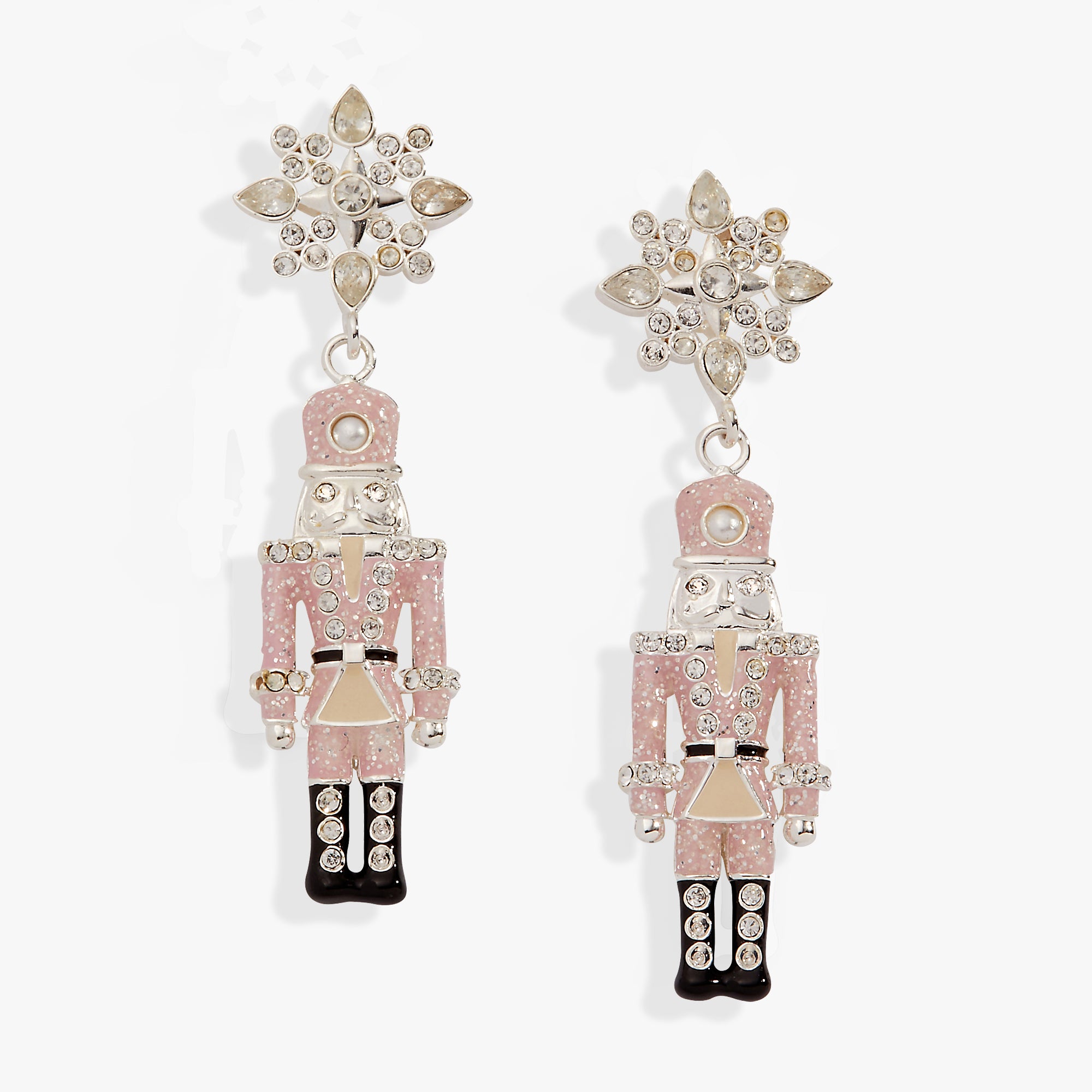 Add a touch of festive whimsy to your look with these Nutcracker Drop Earrings. Each earring features a sparkling crystal snowflake stud paired with a charming nutcracker drop adorned with glitter enamel, pearl accents, and shimmering crystals. Perfect for holiday celebrations or brightening up any day with playful sparkle.