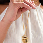 Bring the sunshine wherever you go with this playful picnic basket locket pendant necklace. Featuring a crystal pavé bail, faceted curb chain, and hidden magnetic closure, the dimensional basket opens to reveal a colorful cluster of fruit charms for a charming little surprise. A sparkling ant detail sits neatly along the chain for a cheeky seasonal touch. With its longer length (30" + 2" extender), this piece layers beautifully or makes a statement on its own—perfect for warm-weather days, outdoor adventures, or just channeling picnic vibes anytime.