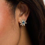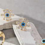 These statement studs shine with playful charm and bold style. Gold-plated with delicate openwork casting, they dazzle with crystal baguettes surrounding a pave center filled with vibrant sapphire and jet crystals. Crafted with fine jewelry quality, these earrings add a whimsical yet meaningful touch to any outfit. Designed for our Evil Eye fans, they carry powerful symbolism of protection, strength, and empowerment. Perfect on their own or paired with matching styles, these studs bring sparkle and positive energy wherever you go. Add a fun twist and a little magic to your jewelry collection!