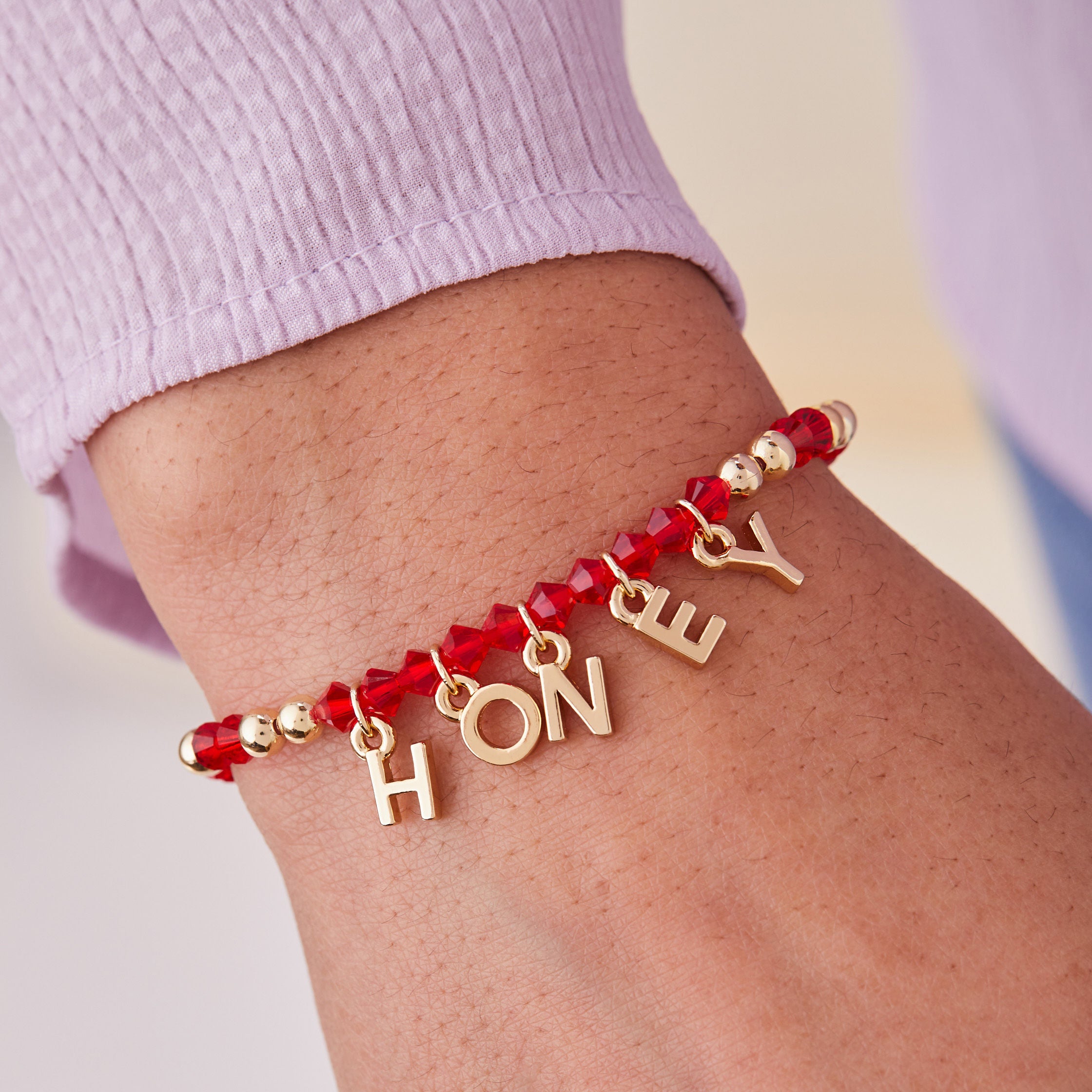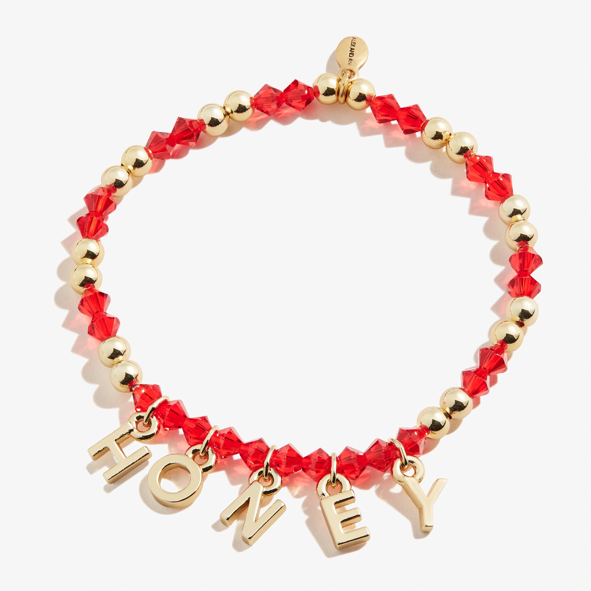 Love is the power that fuels us. When we love others and ourselves, we can reach our innate potential. The Honey Stretch Charm Bracelet features the message "Honey" surrounded by purple beads.