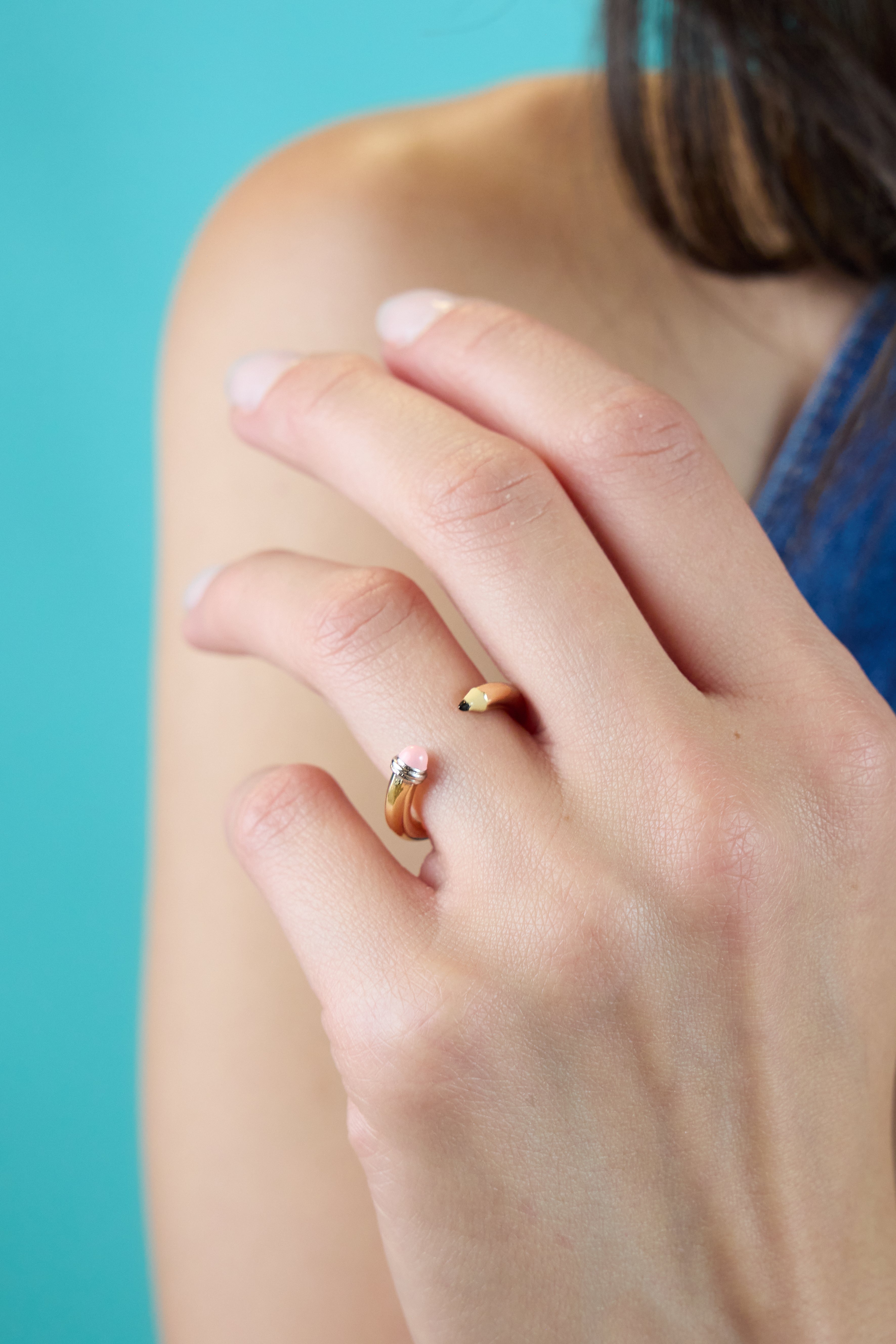 A sharp little statement for your fingers. This open ring wraps a sleek enamel pencil around your finger in a playful twist on classic school-day style. A+ on its own, or paired with the matching cuff for extra credit.