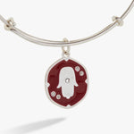 An ancient symbol of protection, the Hamsa hand is believed to ward off negativity and help make space for positive energy. Wear it in a new way with this intricate antique Glass Crystal Hamsa charm bangle, which features an epoxy fill and glass stone hamsa charm with clear crystal accents on an antique silver-tone expandable wire bangle. Stack it with other meaningful symbols for a look that tells your story.