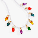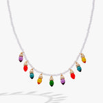 Sparkle and shine this holiday season with this holiday lights necklace. This festive necklace features purple, red, blue, yellow and green holiday lightbulb charms accented with clear crystals, on an adjustable-length beaded necklace. Wear it for a glow all season long.