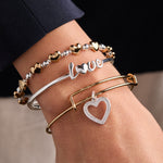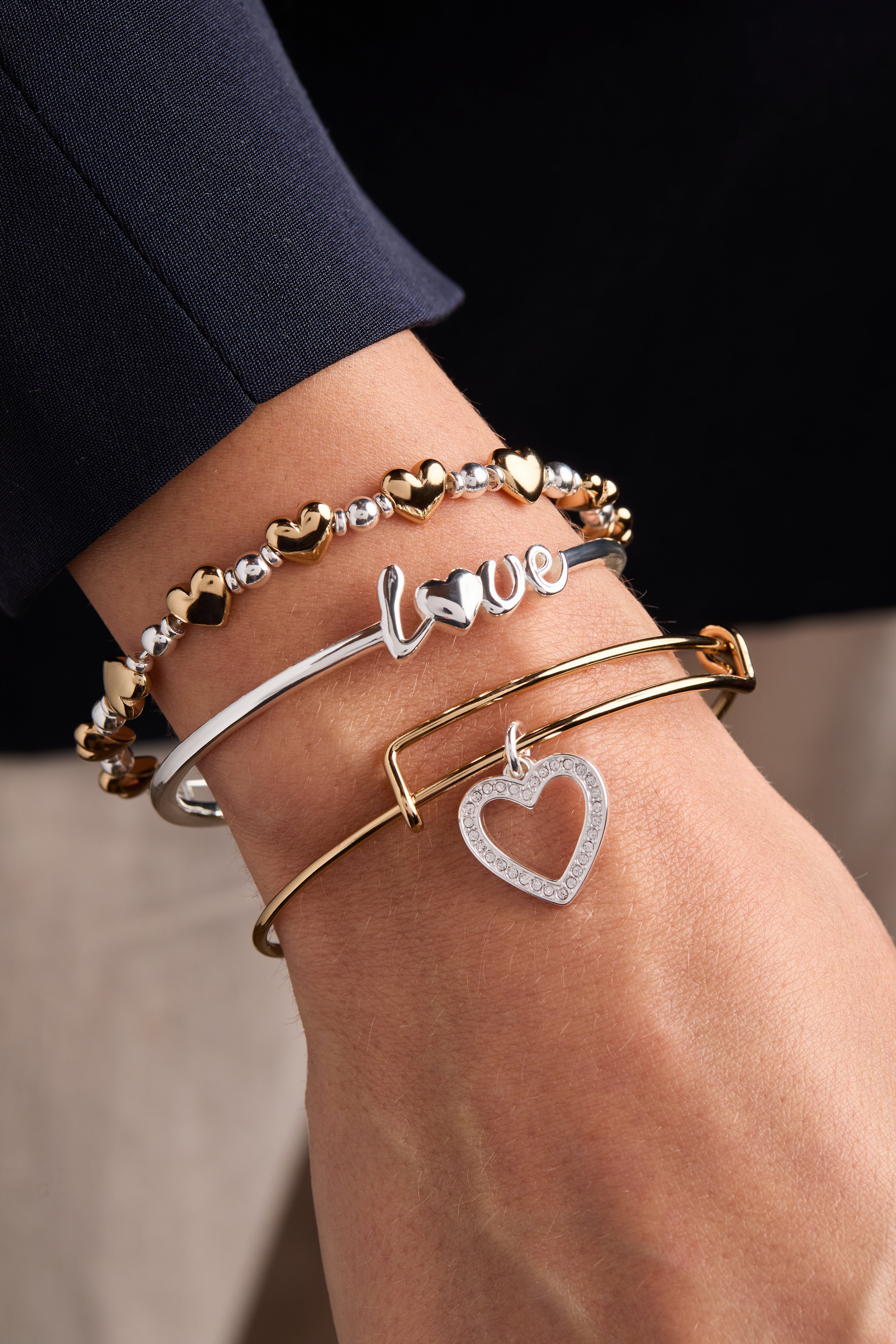 Open your heart when you wear this set of three love bracelets. An adjustable cuff says "Love," while one expandable wire bangle has two-tone heart and metal beads, and another expandable wire bangle has an open heart charm accented with clear crystals. When you give love freely, it will always come back to you.