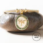 The Dragonfly Interchangeable Charm features gold-tone stainless steel and green jade framed charm with a three-dimensional dragonfly motif at the center. The dragonfly symbolizes transformation, adaptability and the power of self-realization. Add this charm as a reminder to find joy in the little moments of life. Our new, interchangeable charm design lets you make the look all your own: swap out the charms or add symbols to make a charm necklace or bracelet that’s exactly your style.