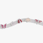 Celebrate how far you’ve come with the Luck Charm Chain Bracelet featuring a window pane design pink and silver butterfly, a crystal-centered daisy, a mother of pearl-detailed ladybug, an epoxy lotus flower, and a pink crystal-detailed dragonfly on an adjustable-length mesh bracelet.