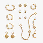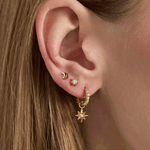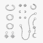 Build your own celestial ear stack with 9 styling pieces: sun, moon, and star studs, a pavé huggie, two ear cuffs, and three detachable charms. Designed for two piercings or more, this set lets you mix, match, and layer your look—no rules, just meaning.
