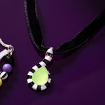 The BEETLEJUICE™ Sandworm Necklace slithers into style with wickedly detailed enamel and eye-popping ruby and green stones. A plush velvet ribbon—tied with a cheeky little bow—lets you switch it up from dramatic necklace to hauntingly chic choker. Part of the exclusive BEETLEJUICE™ collab, this piece is a scream-worthy blend of eerie elegance and otherworldly artistry. Flip it over and you’ll find the iconic warning: “Never Trust The Living”—a ghostly reminder that this accessory is anything but ordinary.