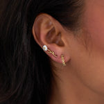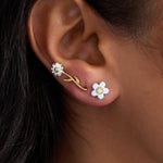 Petals that sparkle. This daisy-inspired 3-piece earring set includes yellow crystal-centered daisy studs, huggie hoops lined with repeating crystal daisies, and a dainty ear climber featuring a mixed-metal design with a silver daisy and a gold stem. A fresh-picked look for any occasion.